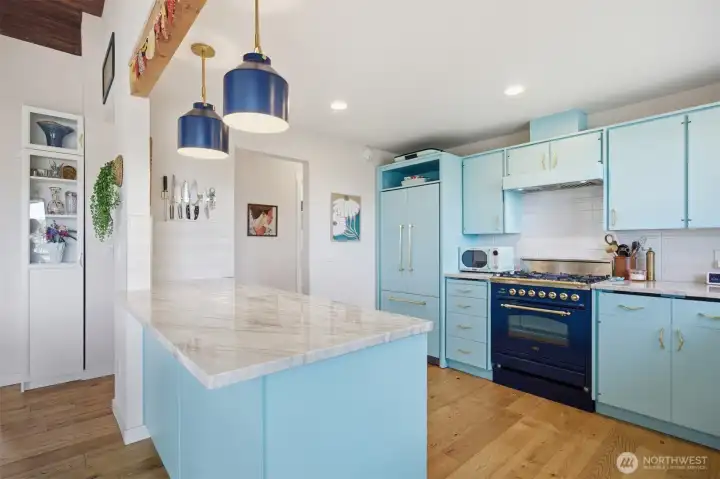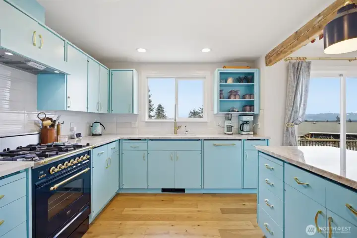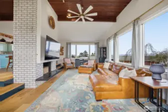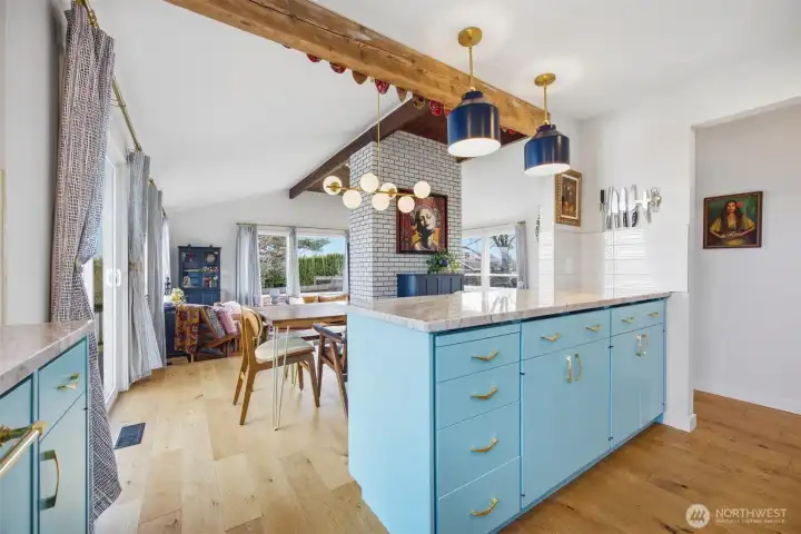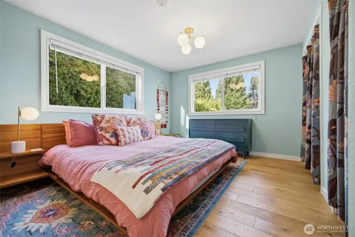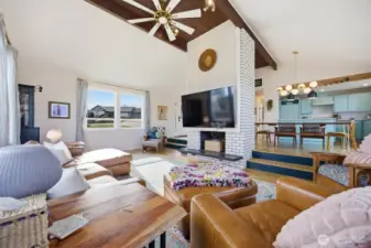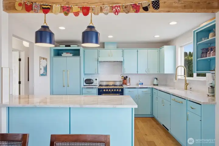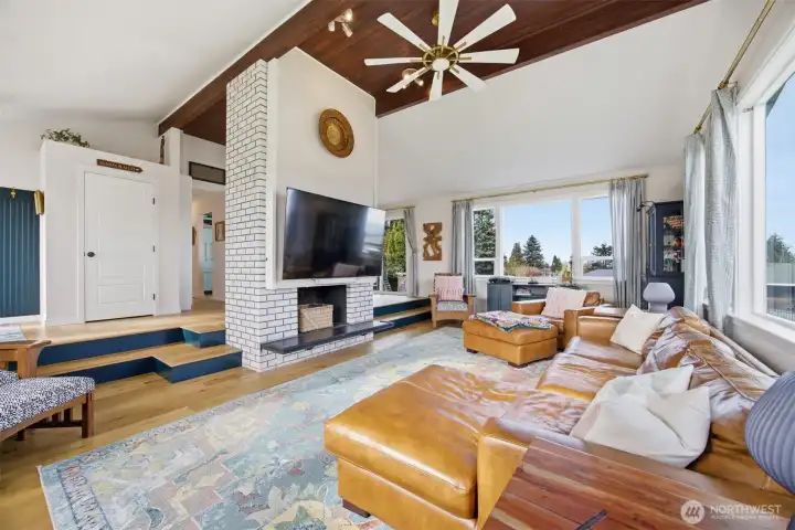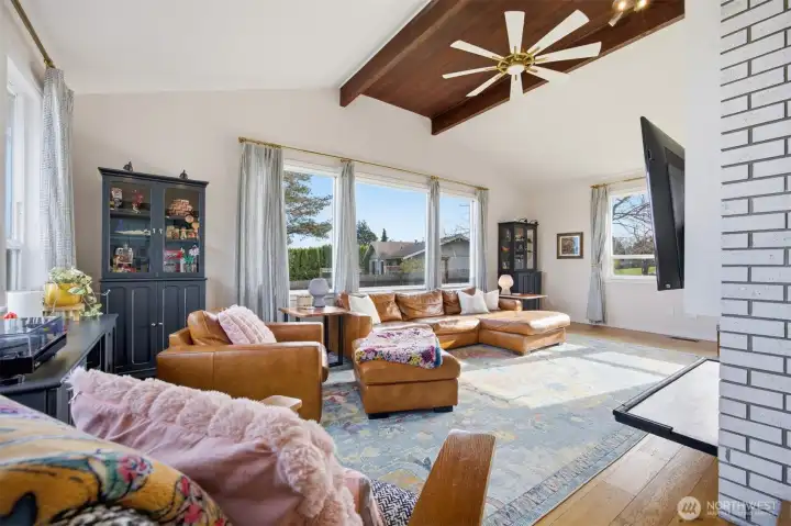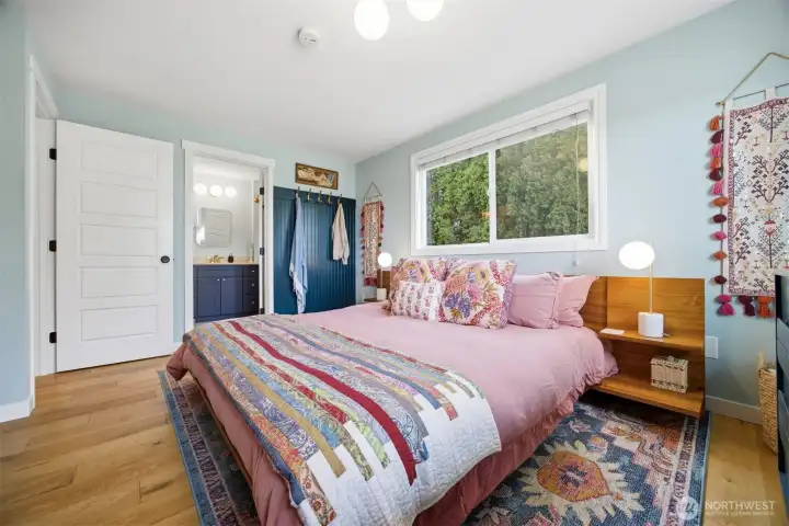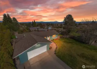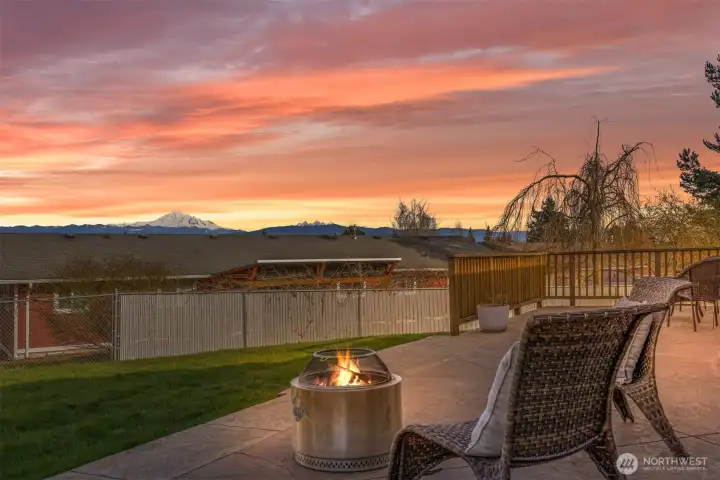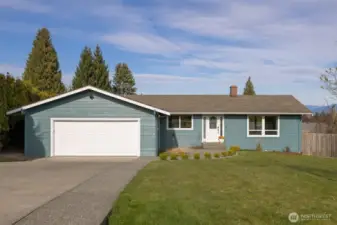 That charming single-level home you've been looking for has arrived, and it comes with an amazing view! Meticulously updated and garnished with impeccable style, this inviting 3-bed / 2-bath rambler is waiting for you on a large sunny lot offering VIP seats to exhilarating sunrises over Mt Baker. The kitchen is gorgeous, standing vibrantly against a market full of neutral palettes. It boasts high-end touches including Taj Mahal quartzite counters, a Majestic gas range, built-in fridge + dishwasher, and mountain views through the window. The layout allows for easy communion with both the dining and living rooms, with the latter boasting vaulted ceilings, big picture windows, and a cozy fireplace. Beautiful hardwood floors stretch throughout the home including all three bedrooms. The primary bedroom comes with a full en-suite bathroom which, along with the full guest bath, are beautifully designed and feature radiant heated tile floors. The backyard is a dream for play, hosting, or just relaxing. A concrete patio stretches the full width of the home, with room for dining, a fire pit, and hot tub with plenty of space remaining. From there, step down to a sprawling, fully-fenced back yard overlooking the verdant valley between you and the mountains. Additional updates include lighting + plumbing fixtures, new interior + exterior paint, A/C, cabinets + epoxy floors in the attached 2-car garage, and more. All this just minutes from parks, I-5, and downtown Ferndale.