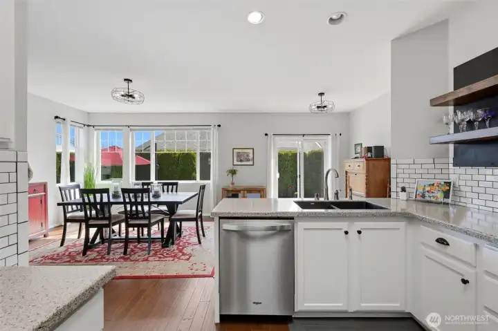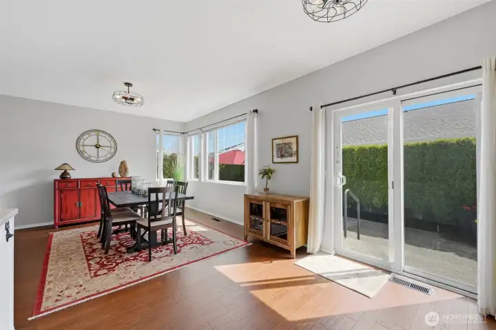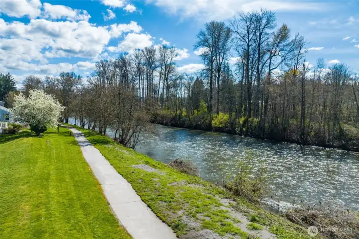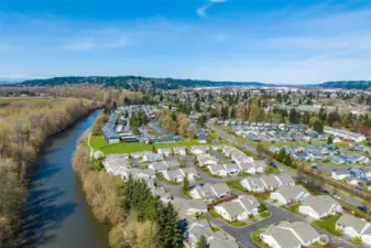 Absolutely spectacular Riverwalk stand-alone, single step condo, thoughtfully remodeled and meticulously maintained. Tucked on a quiet cul-de-sac, corner lot, this light-filled home offers a rare blend of tranquility and convenience with direct access to the scenic riverwalk trail just steps away. Designed for effortless, low-maintenance living, the interior has been beautifully refreshed with bamboo flooring throughout, new interior paint, updated countertops, vanities, fixtures, lighting, and custom window treatments including blinds and drapes. The flexible office feature wall is free-standing, allowing for adaptable living or work-from-home functionality. Major system upgrades provide peace of mind with a new furnace, A/C, and water heater. Outdoor living is equally inviting, featuring an expanded patio with privacy hedge and a water feature for ultimate relaxation. Sprinkler and drip system, plus a custom 18’ retractable awning with remote—perfect for year-round enjoyment. This quiet, well-kept community is known for its ease of living and pride of ownership, often attracting those seeking simplicity without compromise. Whether you're purchasing your first home or right-sizing into something more refined, this home delivers turnkey comfort with undeniable charm. Ideally located near beloved local destinations like Farm 12 and other great farm to table dining options as well as charming Sumner and Puyallup downtowns. This won't last!
