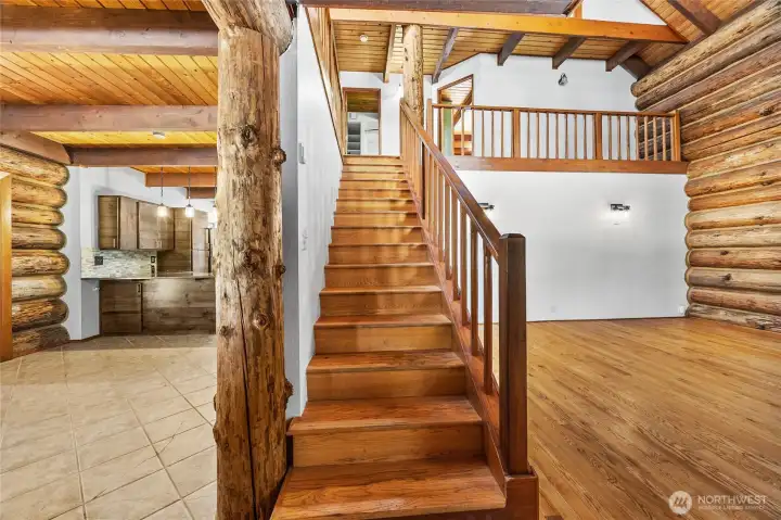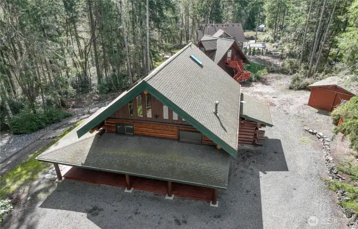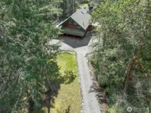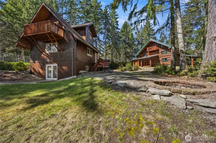 Rare, Award-Winning, Impeccably Kept Log Home on 2.5 Private Acres accessed by a newly grated + graveled road where the only traffic is a deer or bunny! Home features fireplace with dramatic 2-story high stovepipe, wraparound front porch, hot-tub ready covered deck off the primary. All exterior and interior logs have been refinished and re-stained, and chinking expertly upgraded. Main floor primary has two closets, incl floor-ceiling closet system, french-door access to backyard. Up the dramatic oak stairs are two more bedrooms, full bath and large flex area that overlooks main living space. Third floor loft is perfect for playroom, music studio, sleep space, teen hangout. Just a few steps from the home is a separate 3 story permitted building that seller had home gym on the lower level, guest quarters (including charming 3/4 bath) on the top level, with slider leading to deck offering sweeping views, home office on middle level, with built-in standing desk plus gathering space and office/ craft organization. Perfect multi-gen living space, nanny's quarters, home office, home school, church meetings, daycare, artist's or crafter's studio? Exterior bonuses include fenced sport court, firepit, circular driveway, new roof on back bldg and shed,perfect star-gazing, solitude with only two other(long-time owners)homes on the road. All homes on this plat are on 2.5 acres- ultimate in privacy! Just 1 mile to Key Center and 20-30 min drive to Gig Harbor or The Narrows.