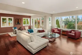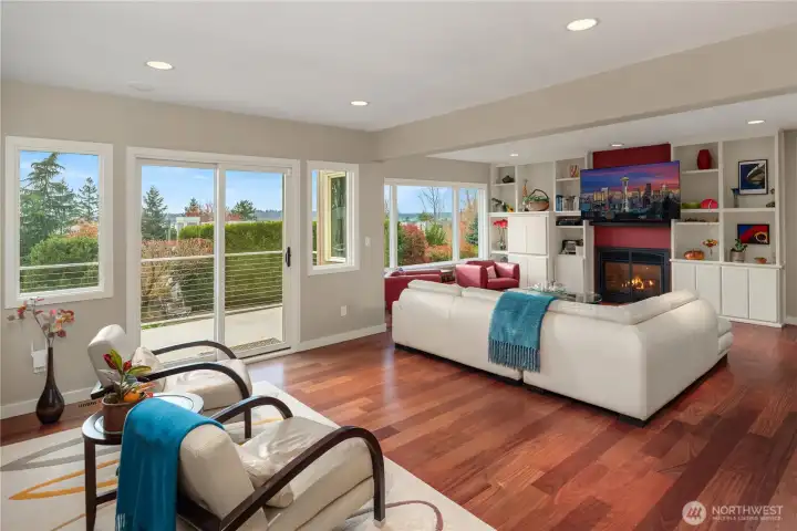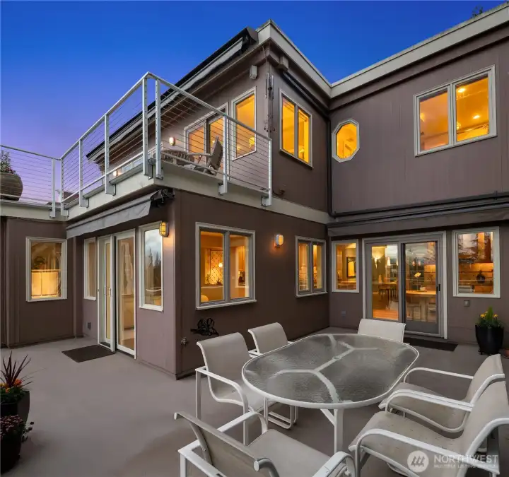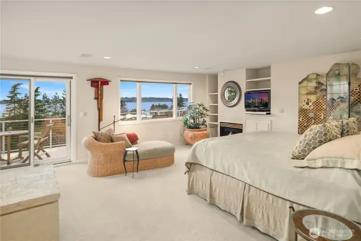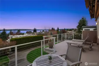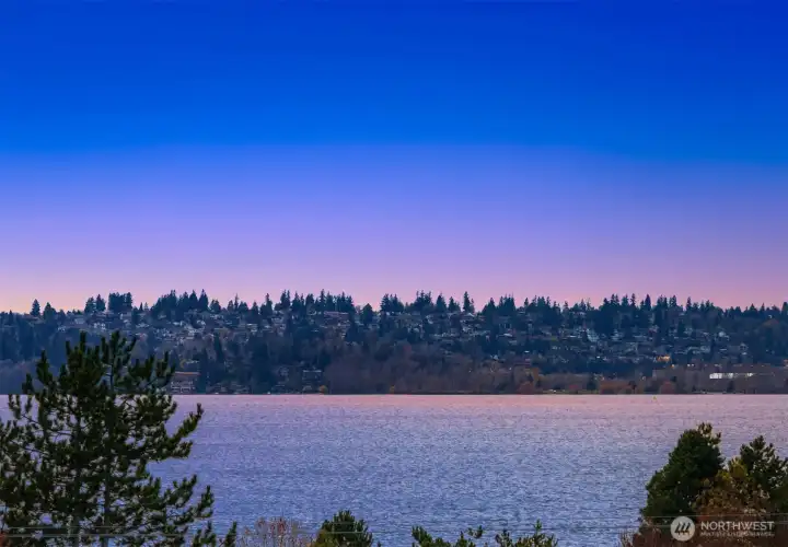 Bold contemporary design steps from Carillon Point, where western-facing views stretch across Lake Washington to the Olympic Mountains. Thoughtfully remodeled in 2006, this home was shaped around its setting, with view decks on two levels that frame the lake from both the main living spaces and the upper-level primary suite above. The kitchen anchors the main floor around a generous center island flowing naturally into spaces designed as much for gathering as for simply settling in with the view. Upstairs, the primary suite opens to its own view deck; a gas fireplace and five-piece bath complete the retreat. A dedicated home gym with its own heating occupies one bay of the three-car garage and converts back easily when needs change. This is a home where the lake is part of the daily rhythm. Carillon Point's waterfront dining and Kirkland's finest shoreline trails are steps from your door, with downtown Kirkland's shops and restaurants just minutes away. Top-rated schools, easy freeway access, and a straightforward commute to Seattle, Bellevue, and the Eastside's major employment centers make the location as practical as it is enviable.