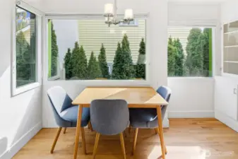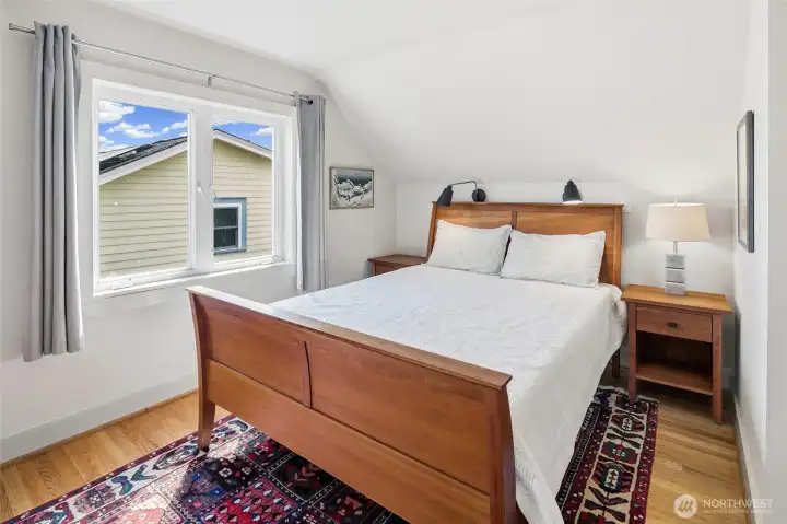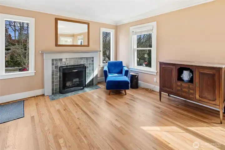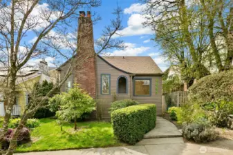 Welcome home to this enchanting Tudor-inspired cottage in the heart of Maple Leaf — where storybook curb appeal, classic craftsmanship, and an unbeatable location come together. With Maple Leaf Park literally steps from your front door, the sprawling green fields, walking trails, and playground feel like a natural extension of your own backyard. The iconic brick chimney, pitched roofline, and arched entry set the tone before you even step inside. Within, refinished hardwood floors and elegant crown molding flow from a warm, light-filled living room anchored by a handsome tile fireplace to a gracious formal dining room. The updated kitchen delights with rich wood cabinetry, subway tile backsplash, and a gas range — and opens to a sun-drenched breakfast nook wrapped in windows overlooking a serene backdrop of mature arborvitaes. Three well-proportioned bedrooms, a stylishly appointed full bath, and an attached garage round out the main footprint. Outside, a fully-fenced backyard with a pergola, mature fruit trees, rain barrels, and a generous lawn creates a private retreat perfect for entertaining or quiet summer evenings. The unfinished basement offers a fully equipped workshop and ample storage — a true bonus for the hobbyist or tinkerer. All of this in one of Seattle’s most beloved neighborhoods, with Olympic Mountain views visible from above and everything Maple Leaf has to offer just outside your door!