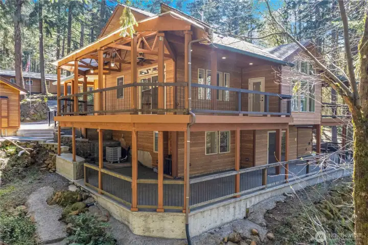 Tucked away on 5.1 wooded acres, this custom-built 3,444 sq ft home blends privacy, flexibility & exceptional hobby space w/ main-level living & multi-gen potential. Features 3 lg bedrooms, 2.5 baths, 9 ft ceilings & vaulted accents. Beautiful flooring & custom cabinetry highlight the craftsmanship, while the open kitchen, dining & living areas create great flow. Kitchen includes island, eating area & walk-in pantry. Main-level primary offers spacious ensuite, walk-in closet w/ dressing area & W/D hookups. Large bonus/flex space on main. Daylight basement adds versatility w/ separate exterior entrance, living area, bath & 2 bedrooms—one w/ kitchenette incl. sink, fridge & microwave—ideal for extended living or guest use. Enjoy 1,200+ sq ft covered outdoor space incl. Bankirai hardwood deck & patio w/ territorial views. Wooded privacy, usable space w/ varied topography, RV parking/storage & seasonal creek. 1270 sq ft detached (extra deep) garage includes permitted 336 sq ft studio w/ updated bath & potential for full kitchen (no stove/refrigerator). Expansive 2700 sq ft shop w/ Dannmar 10,000 lb lift, 40-gal air compressor, air hookups & multiple bay doors incl. 12x12 & two 12x14 drive-through. Water connected. Additional features: whole-house ventilation (Lifebreath), spray foam insulation & over 300 sq ft useable attic space w/ shelves—plus so much more! New HVAC, hot water heater & new roof prior to closing. Road maintenance HOA $160/year.
