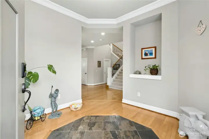 New England style craftsman and former Specialized model home located on prime 30th Ave corner lot. Showcasing exceptional architecture and high-end finish work, this stunning residence welcomes with a formal rotunda foyer creating an impressive entry. The 10' ceiling design features an open main plan including formal dining and living rooms with double sets of French doors opening to covered patio - ideal for both everyday living and entertaining. A chef's kitchen with beautiful pine cabinetry, oak hardwood flooring, an expansive center island, and an inviting breakfast nook, also opens to the family room. A grand staircase leads to upstairs retreating to a private primary suite complete with sitting room, primary bath and walk-in closet. Upstairs finds a total of 4 bedrooms, with second bedroom ensuite, plus 3 full bathrooms and laundry room. The versatile bonus room with views could be used as a 4th bedroom with the Jack-and-Jill bathroom. Additional highlights include extensive millwork, custom inlays, wrought iron railings, expansive windows, vaulted ceilings, and built-in cabinetry. The exterior has been newly repainted and this home has been well maintained. Enjoy beautiful territorial views, a spacious two-car garage offering high ceiling height for future loft and/or storage capabilities. Steller Issaquah Highlands location on quiet street, yet close to parks, Grand Ridge Elementary and much more.