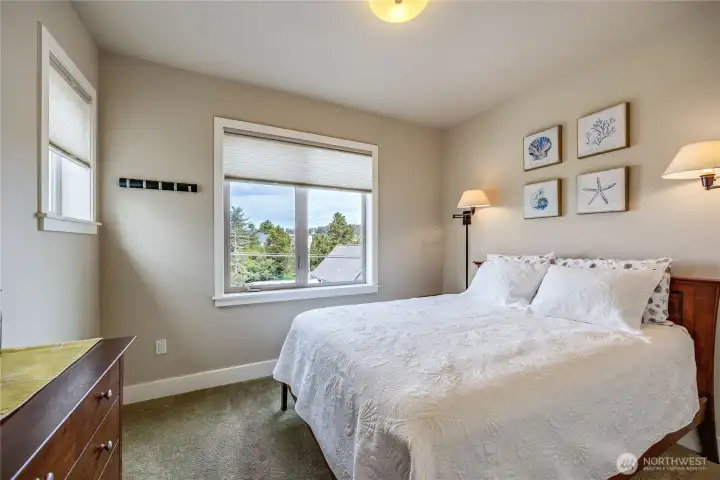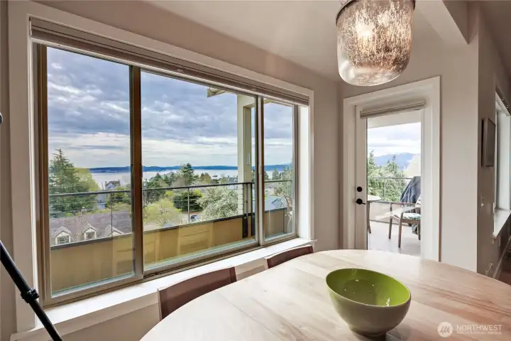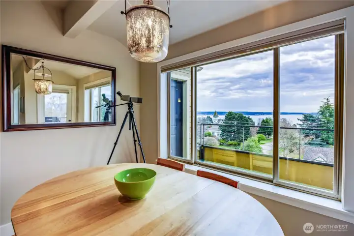 Oak floors, propane fireplace and a stunning view of the mountains and bay.