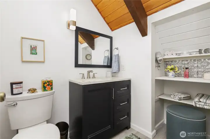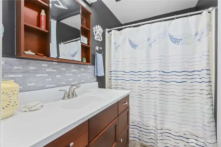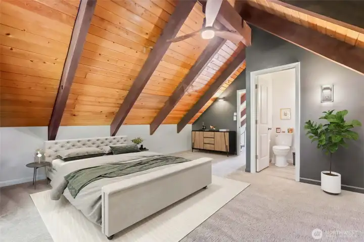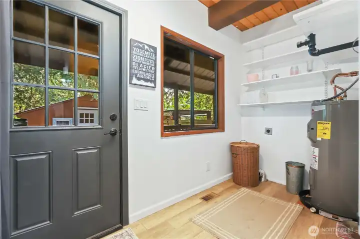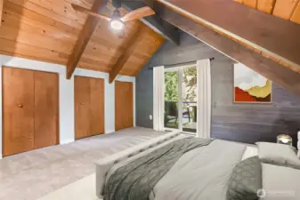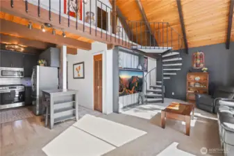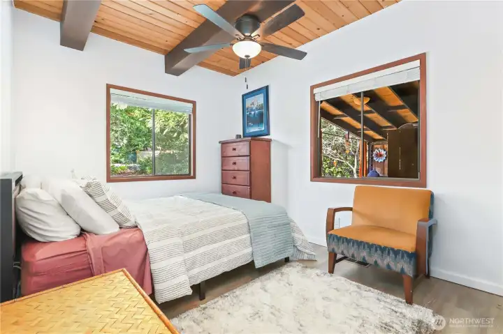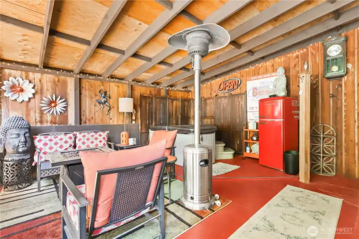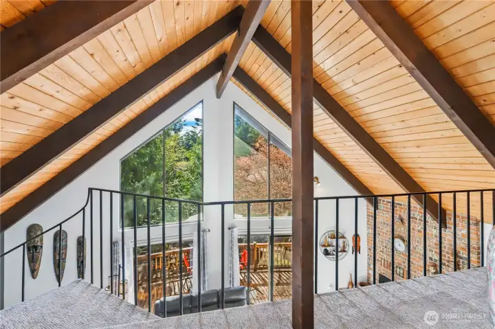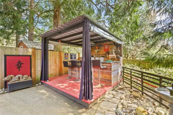This majestic property boasts forty conifers, providing ample privacy and a serene atmosphere, just two minutes from Puget Sound. Outdoor living is a true highlight, with three separate covered spaces perfect for relaxing or entertaining. The main living room features soaring cedar-lined ceilings and expansive windows that flood the space with natural light, anchored by a dramatic floor-to-ceiling brick gas fireplace. A striking steel spiral staircase leads to a spacious loft and private primary bedroom, complete with a half bath. The main living area includes two bedrooms and a full bathroom. Step outside onto a massive deck to enjoy breakfast, then discover an Asian-inspired hangout/bar and fire table sitting area. The attached carport has been transformed into a beautiful outdoor living space, complete with a jacuzzi. Relax by the fire table, open the curtains, and take in the view of majestic cedar trees. Additional features include a workshop, storage cottage, and garden shed. Upgrades include a renovated kitchen, all new doors, a roof replaced in 2022, a new hot water heater, and updated flooring throughout. Enjoy access to Shelter Bay’s exceptional amenities, including a swimming pool, tennis courts, marina, golf course, clubhouse, private beaches, and BBQ area. Please note: this property is part of the Shelter Bay master leasehold agreement and is not fee simple land ownership.