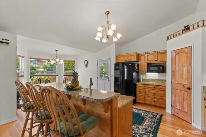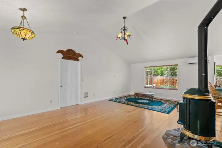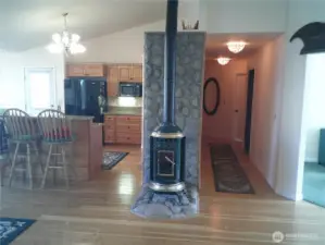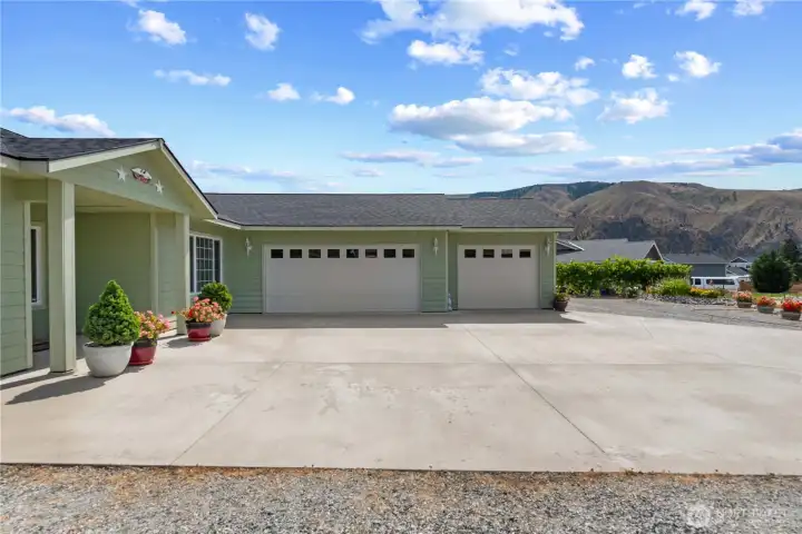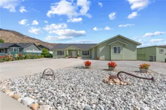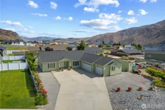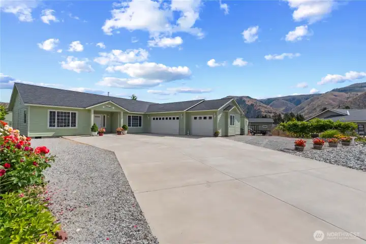 Beautiful Lexar Custom Rambler on large lot with southern exposure & mountain views! Level entry/zero steps, fully finished 3-car garage w/heat/air, garden window, storage spans above & space for 14 cars/RV parking with hookups in driveway, granite counters throughout, large eating bar, "Thelin Parlour" gold plated wood stove, Montana tight knot red fir floor, real wood not LVP, tiffany glass lighting, Italian ceramic tile, nice primary suite, walk-in closets in all 3 bedrooms, 2 full baths, den/office, Mahogany door with leaded glass to laundry room, Cal spa hot tub w/swim spa concrete pad w/50 Amp GFI, Hardie Board Lap Siding, fenced back yard w/raised garden beds, 2 fully finished sheds w/power, 15 fruit trees, apples, plums, cherries, peaches, nectarines, serves as privacy barrier, irrigation water, quality inside & out! No HOA fees!