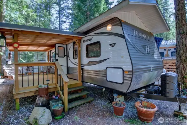 Like new 2015 Hideout Travel Trailer included in this private feeling lot in division 2 at The Glen at Maple Falls. Trailer is perfect for all weather conditions features; electric fireplace, Roof mounted Airconditioning, built-in vacuum, new refrigerator, cold weather package, ie better insulation, covered deck, lots of wood. Flat screen tv, CD,/radio with outside speakers. propane connection for a barbeque. Insulated shed on lot a great flex space and/or storage. Location is close to trail head to Nooksack River. The Glen is zoned recreational for 120 days of use out of the year and has all the amenities you could want, including 2 pools, hot tub, pickleball courts, wooded disc golf course near the Nooksack River, library, laundry mat, 2 clubhouse, 24 hr security, gated entry, & play areas.