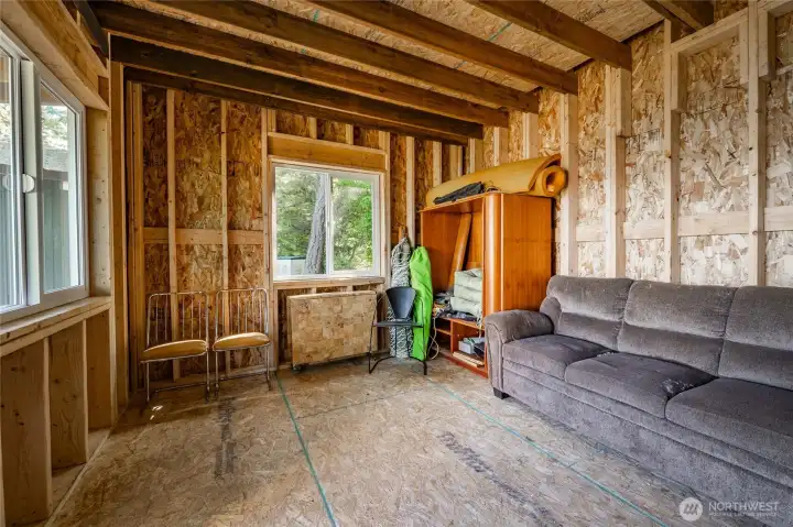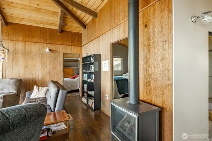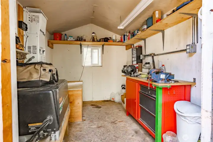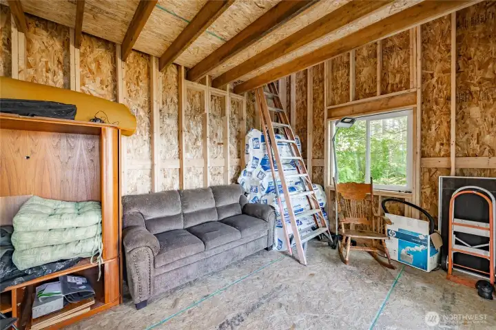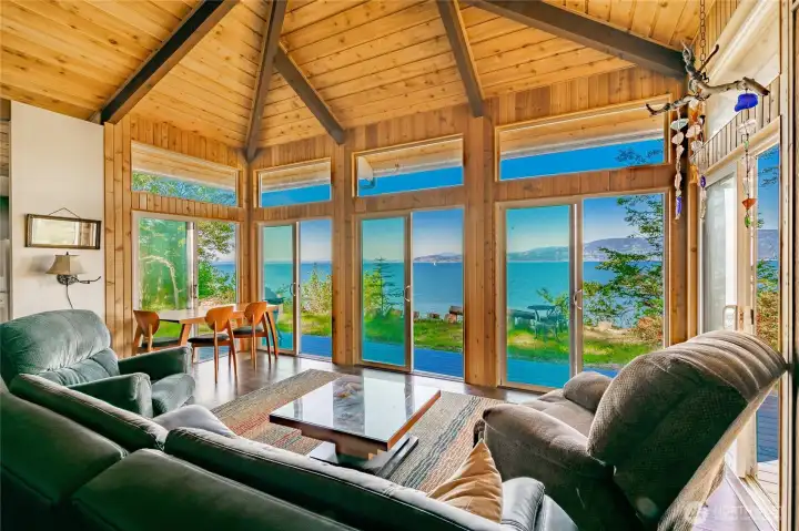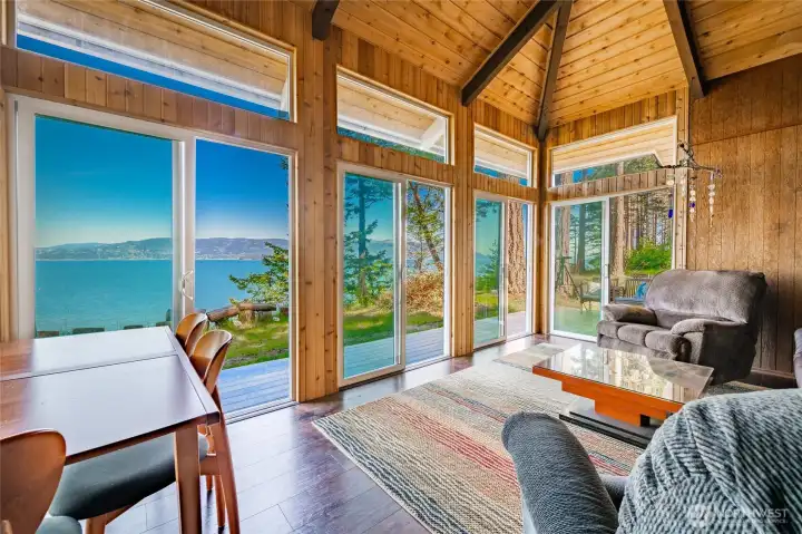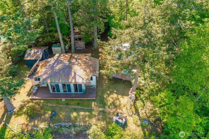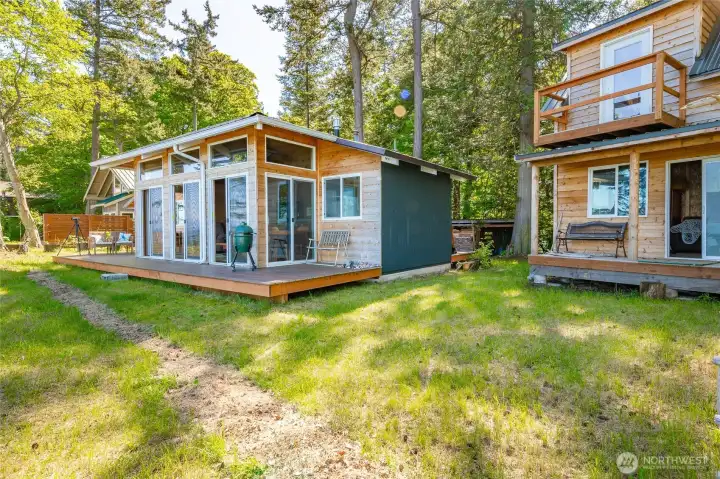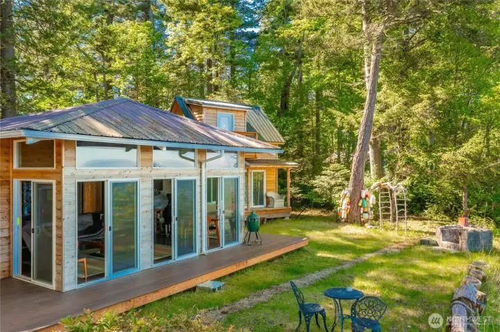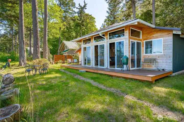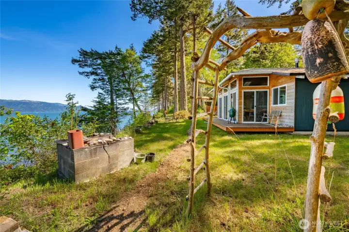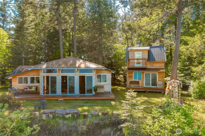 High bank waterfront cabin on private Eliza Island, just off the coast of Bellingham in Whatcom County. This 2-bedroom retreat captures sweeping eastern views of Bellingham Bay, the Canadian mountain range, and Chuckanut, with stunning sunrise exposure that fills the home with natural light. The cabin features natural wood interior paneling and vaulted ceilings that create a warm, open feel. A propane stove adds comfort year-round, while the propane paired with a solar and battery-powered inverter supports easy off-grid living. An additional unfinished outbuilding offers flexibility to make it your own—ideal for a bunkhouse, storage, an office, or a creative space. There is no direct beach access from the lot, but nearby access points are just a short walk or golf cart ride away, making it easy to enjoy. This property is well-suited for shared ownership—consider partnering with friends, or colleagues to create a private island retreat and maximize use throughout the year. While short-term rentals are not allowed on Eliza Island, co-ownership provides a smart and enjoyable way to experience island living. Island amenities include a full-time caretaker, tideland rights, beach access points, park areas, and a private airstrip (WA93), making it a great option for aviation enthusiasts or those seeking a true Pacific Northwest island escape. Located approximately 20 minutes from Bellingham by boat, with walk-on water taxi access available. No rentals allowed.