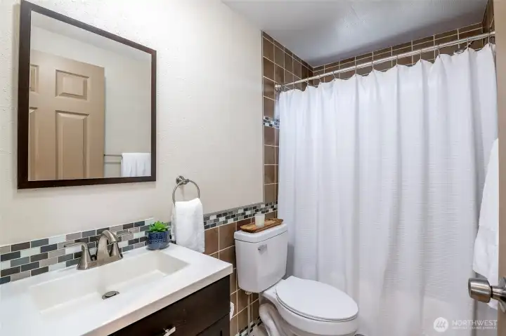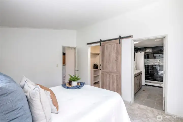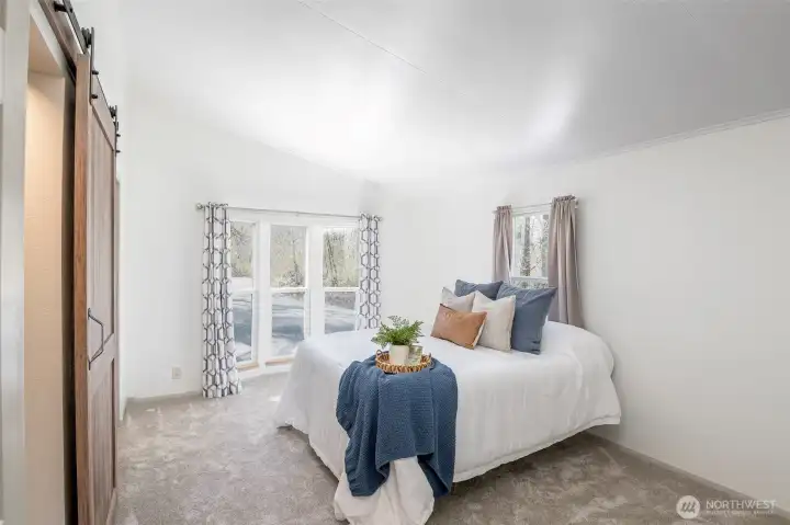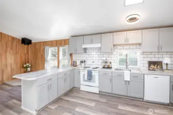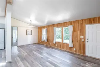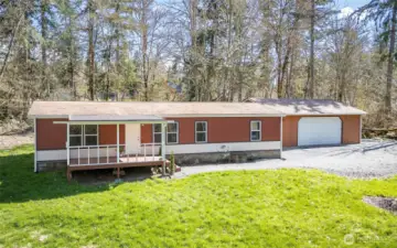 This beautifully updated rambler is nestled on a peaceful 2.5-acre lot in Eatonville, offering both style and comfort. The open-concept great room with its inviting living and dining areas boasts a charming ship-lap wall accent, durable vinyl flooring, and soaring vaulted ceilings featuring a striking wooden beam accent. The chef’s kitchen is a true highlight, with a full-height tile backsplash, sleek grey shaker cabinets, and brand-new appliances—perfect for cooking and entertaining. The spacious master suite features a walk-in closet with a barn door entry, along with a newly remodeled 3/4 en-suite bath, including a tiled walk-in shower and a modern dual-sink vanity. Two additional generously-sized guest rooms provide plenty of space for visitors, along with a stylish full guest bath. Throughout the home, a whole-house stereo system enhances the ambiance. Outside, the large detached 2-car garage offers ample storage, and there’s plenty of space for RV parking. Enjoy the surrounding territorial views and the privacy that comes with a property of this size. This home is the perfect blend of modern updates and serene country living!