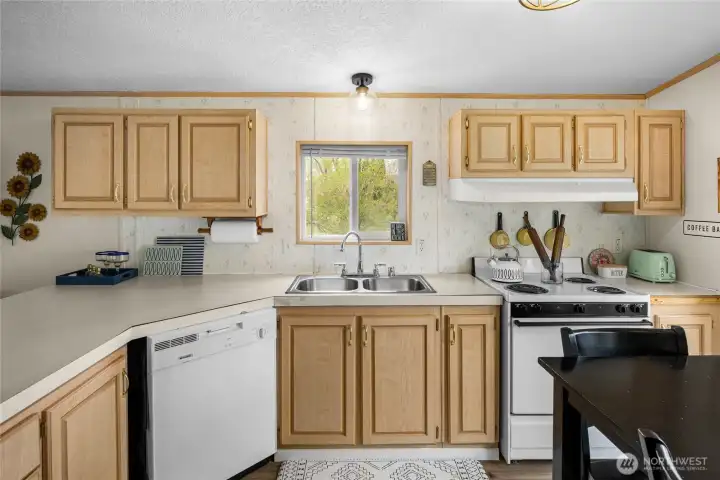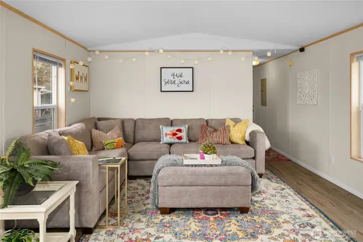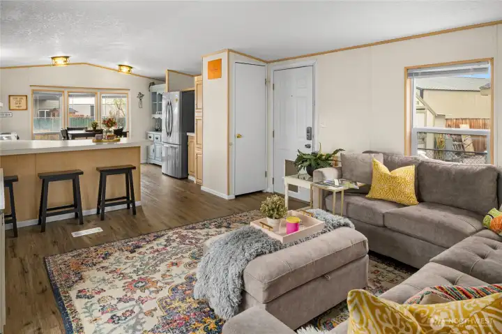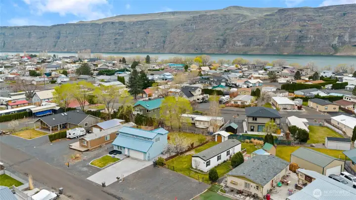 A hidden gem in Sunland Estates! This manufactured home is tucked amongst mature greenery, serving as a sunny oasis brimming with potential. An oversized driveway offers space to grow (RV hookups? Garage?) with fully-fenced yard. Inside an open floorplan makes hosting easy, with spacious kitchen & bay windows framing sunlit views. Vinyl planking extends throughout, with 2 beds + 1 full bath. Details include new A/C & furnace (2023), sprinkler system, security cameras, washer hook up, 10x10’ shed, double swing gate to yard & quiet neighborhood location. Community amenities include pool, tennis & pickleball, park with river access, boat launch, & more. Just minutes to Cave B, Sagecliffe Resort, & the iconic Gorge Amphitheatre!
