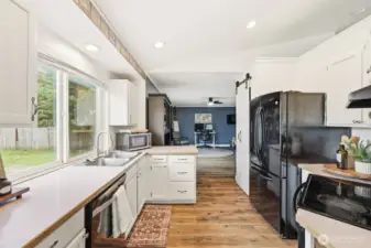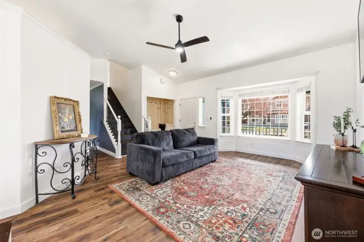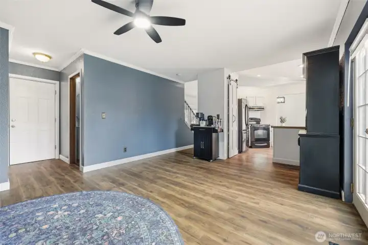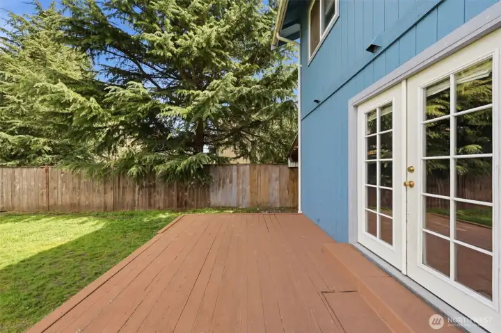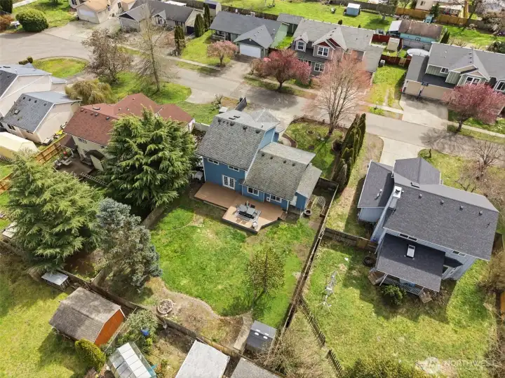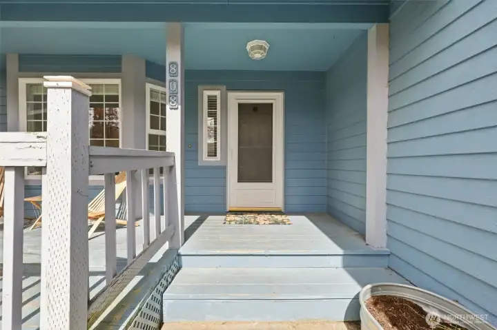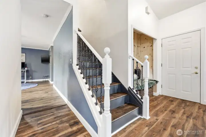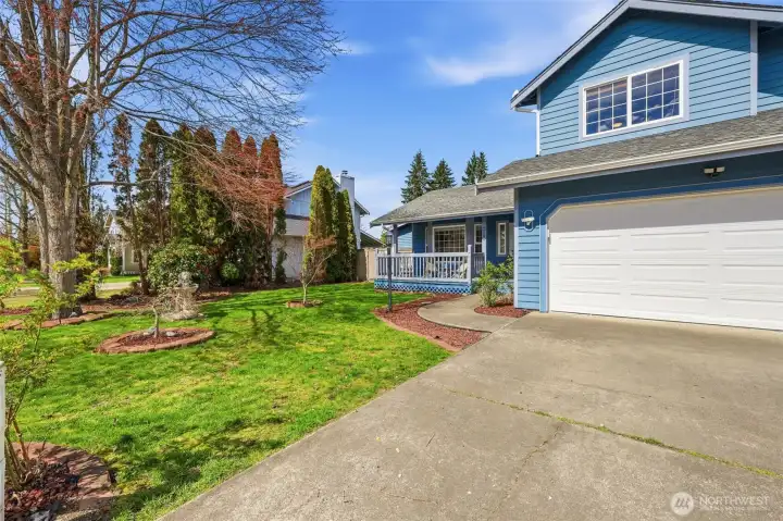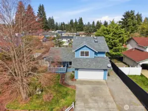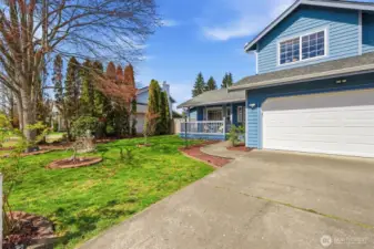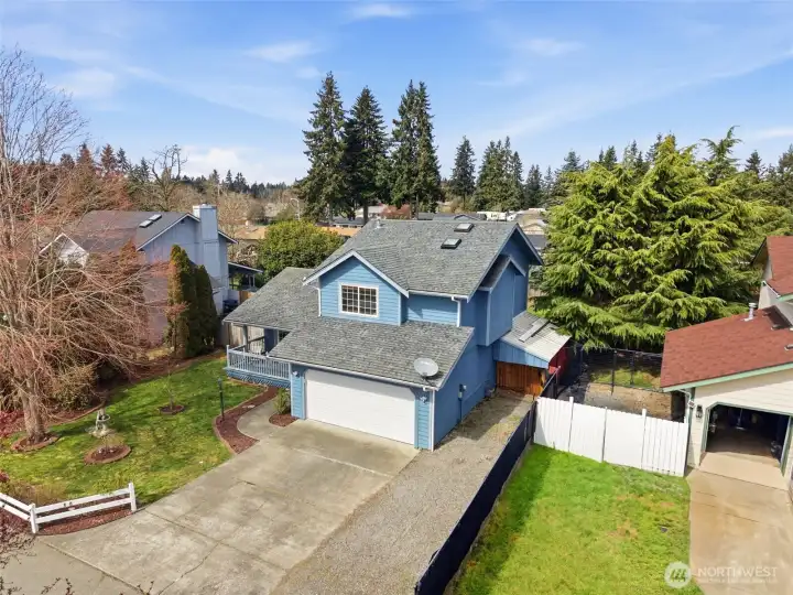 Nestled in the heart of Yelm, this thoughtfully updated 3-bedroom, 2.5-bath home offers a bright, open feel with vaulted ceilings and a natural flow between spaces. New vinyl plank flooring runs throughout the home, paired with oversized windows that bring in abundant light and create an inviting space. The entry features a tongue-and-groove nook with built-in bench seating, adding both function and a warm, custom feel. The staircase has been fully updated with new flooring and a refreshed railing. Freshly painted cabinets give the kitchen an updated feel, along with a dog door for backyard access. A gas hookup is in place for a future fireplace in the family room. All bedrooms are generously sized with walk-in closets, including a spacious primary suite with an attached bath. Two bathrooms have been fully renovated, including new vanities, fixtures, and toilets. Both upstairs bathrooms feature skylights, bringing in additional natural light. French doors lead to a spacious, fully fenced backyard with a freshly painted deck, perfect for relaxing or entertaining. The backyard also includes a garden shed, additional storage, and a covered pad with generator hookup. A fountain and mature trees offer shade and charm, enhancing the front yard. The home also features a 2-car garage. Located on a quiet cul-de-sac with no HOA, just minutes from the new middle school, within walking distance to the Yelm Prairie Trail and dog park, and about a 20–30 minute drive to JBLM or Lacey.