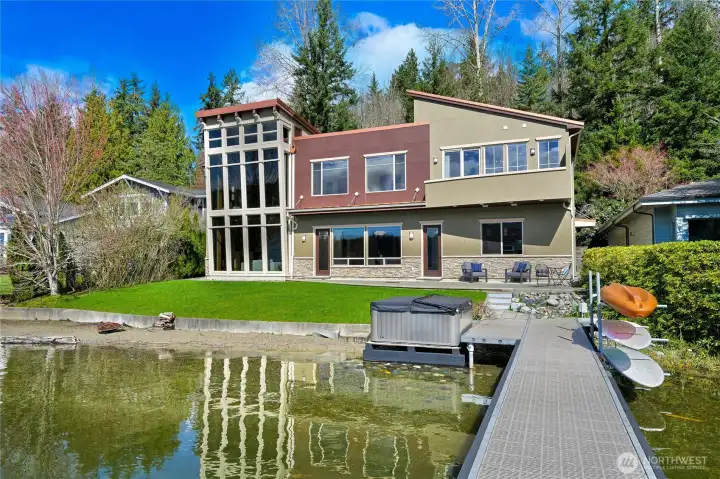 Experience rare beachfront lake living in desirable Dellesta Park, featuring a sandy shoreline, mature trees for exceptional privacy, and premium south-facing exposure for all-day sun. This custom-built, first-time-on-the-market home offers a fantastic floorplan with 4,200+ square feet, 5 bedrooms, a den and multiple living spaces, enhanced by dramatic floor-to-ceiling glass capturing expansive water views and breathtaking sunsets. Level, newly landscaped yard with bulkhead, beach, and an extended dock. Recent upgrades include a new hot tub set to capture the starry nights, newer roof, dual heating/AC units, plus kitchen and bath updates. Timeless craftsmanship shines throughout with Brazilian cherry floors, Italian-imported granite, marble mosaic art, and high-end cabinetry. Make this summer unforgettable on beautiful Lake Whatcom!
