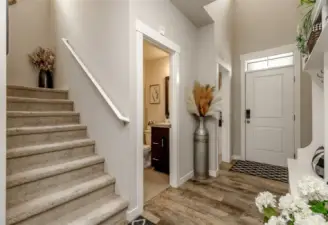 Welcome to this spacious and stylish 5 bedroom + bonus room, 2.75-bath home nestled in Bonney Lake. A charming covered front porch invites you in. The great room features a gourmet kitchen with an island, stainless steel appliances & living room with electric fireplace. The main level also offers a formal dining room, 3/4 bath and a flexible room perfect for a guest bedroom or home office. Upstairs you will find 4 bedrooms, a full bath, laundry room and an expansive bonus room — plus a serene primary suite complete with a 5-piece bath and walk-in closet. Backing to a protected natural area, this home offers a rare sense of privacy and tranquility. Conveniently located close to parks, trails, shopping and Lake Tapps.