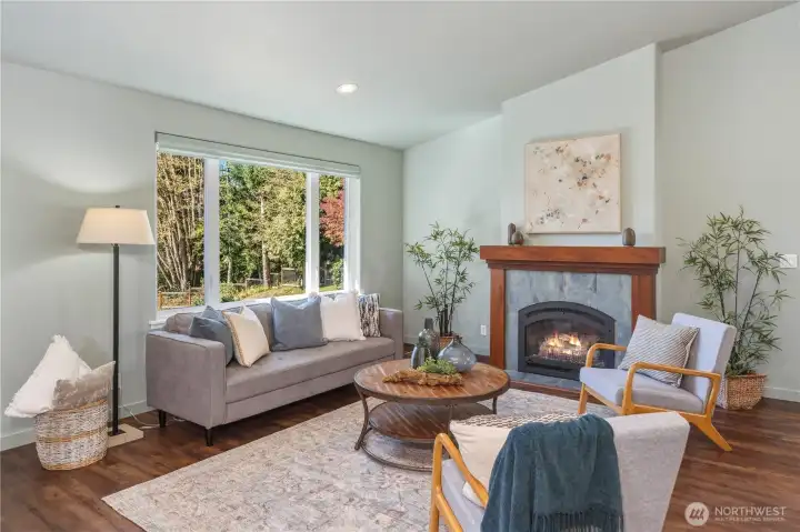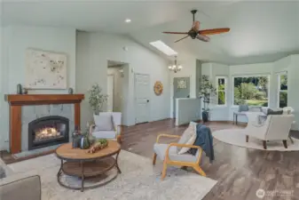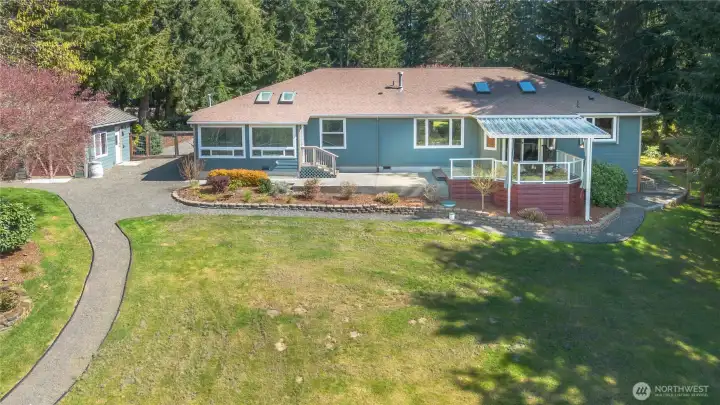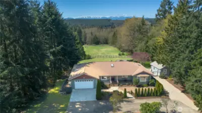 Enjoy Olympic views on Heavenly Place with this gorgeously updated single level home. The thoughtfully designed kitchen is sure to impress, featuring pull-out shelves, corner optimizers, porcelain countertops, instant hot water, a movable island, and high-end appliances. The living room offers a warm and inviting space with a propane fireplace—perfect for cozy winter days while taking in views of the snow-capped Olympic range. Down the hall, you’ll find a spacious primary suite with a walk-in closet and a luxurious five-piece ensuite bath, complete with heated floors, a standalone soaking tub, Kohler fixtures, and a dedicated tankless hot water heater. Just off the primary bath is a versatile flex room, ideal for an office, workout space, or retreat. Step outside to enjoy summer evenings on the covered IPE deck. The property is partially fenced for your pets with beautiful mature landscape and a 10x20 shed for your tools. Conveniently located just five miles from the Kingston ferry, George's Corner park & ride and close to shopping and everyday amenities, this home offers the perfect blend of comfort, style, and location.