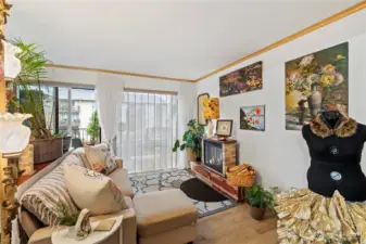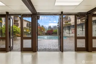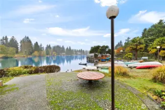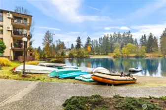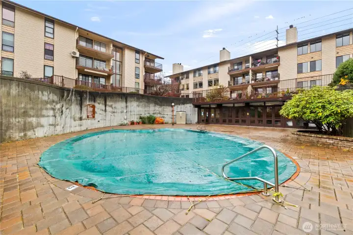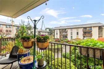 Lakefront living at its finest! This desirable interior unit has a private balcony overlooking the courtyard gardens and pool with view of the lake. This complex is one of Seattle's best kept secrets with fully gated access hiding a private beach on Bitter Lake with dock and fishing pier, a tennis court, a huge heated pool with cabana containing event space, kitchenette and changing rooms; and two nicely appointed game/exercise rooms. Nicely remodeled with new appliances and bathroom cabinetry, ceiling fan, a new electric fireplace, and a small in-unit washer dryer. Includes deeded parking space and storage locker on balcony. Enjoy peaceful comfort and the benefits of resort style living in the heart of Seattle :)