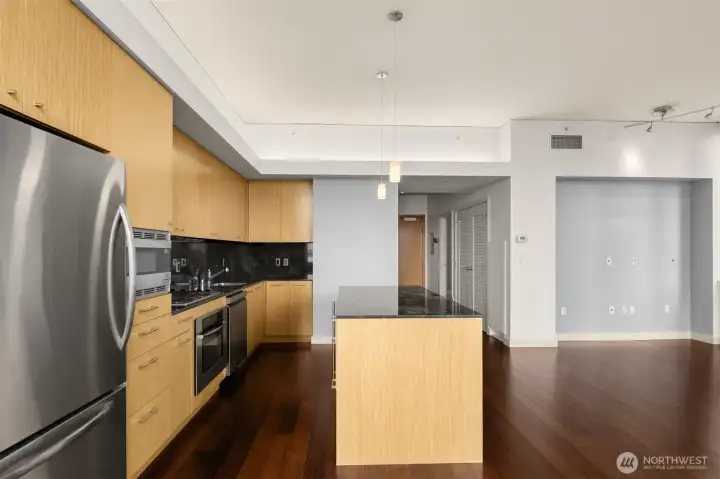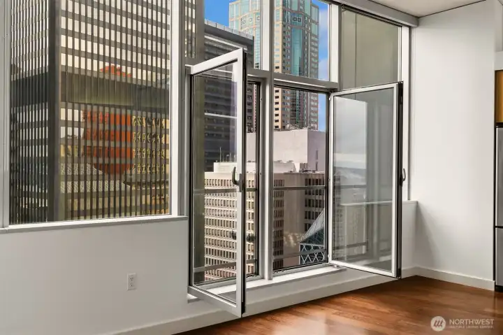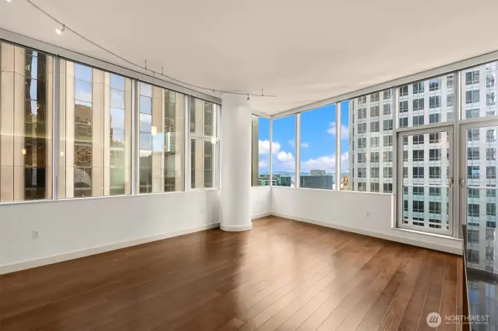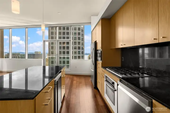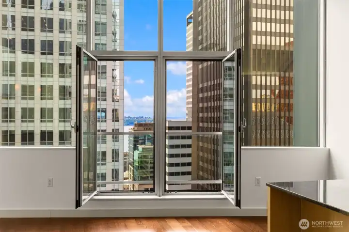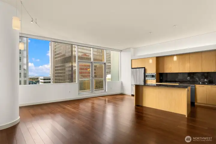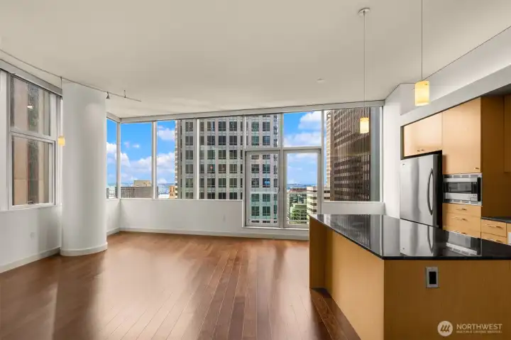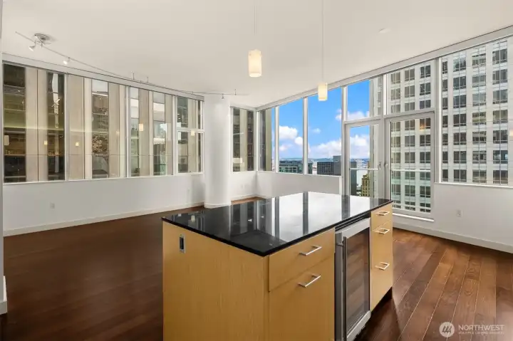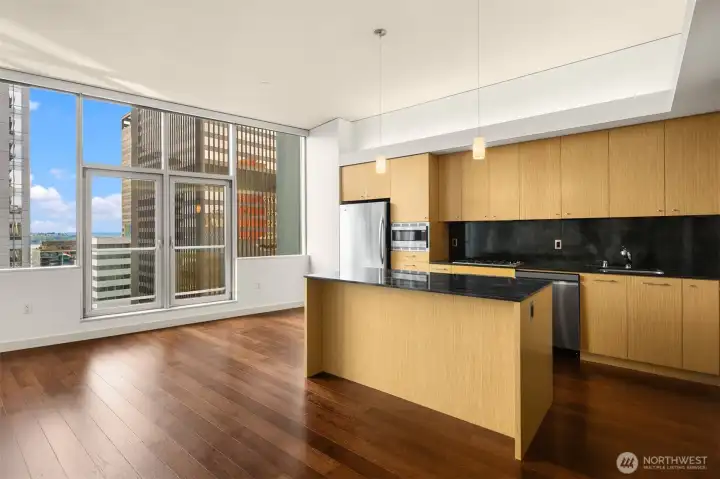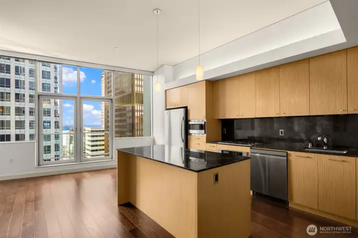 Beautiful downtown Seattle condo at 5th and Madison. Enjoy premium living, an end-unit, and the views of Elliott Bay. Open concept layout, floor-to-ceiling windows flood the space with natural light. Modern finishes, hardwood floors throughout for polished look and feel. 1 generous-size bedroom with walk-in closets, kitchen with granite island, stainless steel appliances, 1 full bath and in unit washer and dryer. Amenities: fitness center, game room & rooftop deck. Walking distance to Pike Place Market for fresh produce, restaurants, grocery stores, and a waterfront park. Comes with 1 assigned parking and storage space. No rental cap