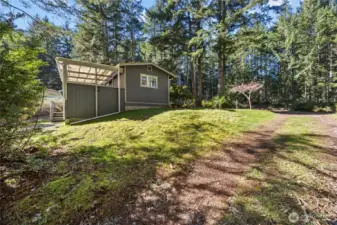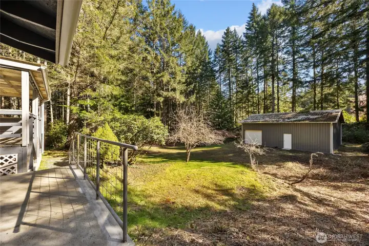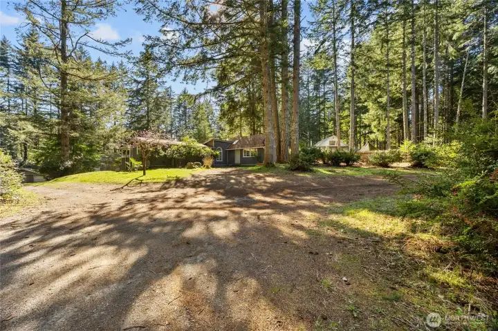 Tucked behind a gated entry on a beautiful, private wooded lot, this Lakebay property offers a peaceful setting surrounded by mature trees and natural beauty, along with ample RV parking for added flexibility. Step inside to find dark vinyl plank flooring that flows throughout the main living areas, complemented by abundant natural light streaming through the windows. Living space opens into a warm and functional kitchen featuring knotty pine cabinetry, a rustic island with built-in drawers for added storage, and a double oven. Primary bedroom offers a 3/4 bathroom, and an additional bedroom offers a unique retreat with direct access to a built-in deck, creating a quiet outdoor escape. A covered deck porch extends your living space year-round, ideal for relaxing and enjoying the tranquil surroundings. Outside, the property continues to impress with two versatile outbuildings: a 23’ x 18’ shop with power and a door for easy access, and a spacious 37’ x 30’ garage offering ample storage or workspace (no power). A rare combination of privacy, functionality, and natural charm—this property is ready to fit a variety of lifestyles.