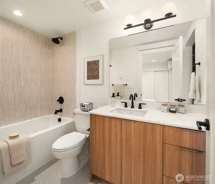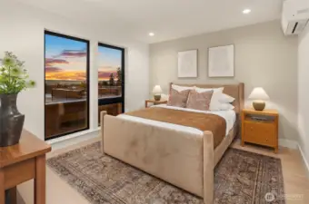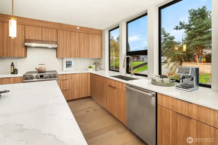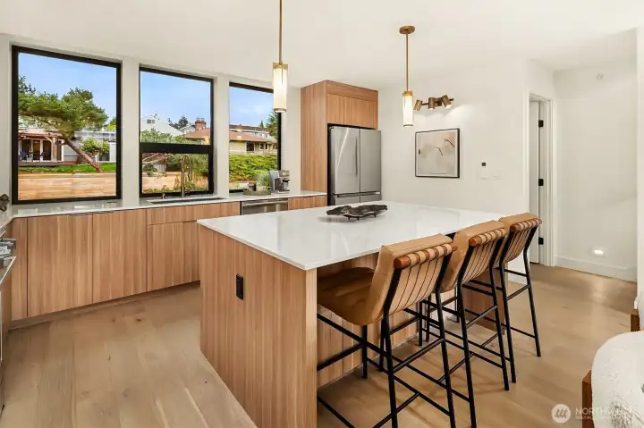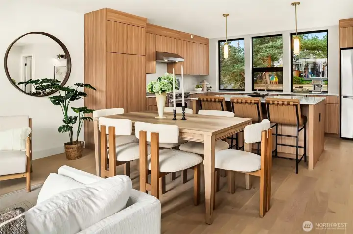 Experience the best of walkable downtown Edmonds living in this stunning new-construction home at Pine Park. Modern and stylish, this townhome blends clean architectural lines with warm, curated finishes, including wide-plank white oak floors and designer lighting throughout. The open-concept living spaces are bright and inviting, with expansive west-facing windows and seamless access to a deck that makes relaxing or entertaining easy. The kitchen is both striking and functional, appointed with a full suite of stainless-steel Dacor appliances, flat-panel cabinetry, and beautiful Daltile Monte Lucia quartzite surfaces that elevate everyday living. A versatile live-work space adds exceptional flexibility, ideal for a low-density business, studio, office, or rec room. The primary suite offers a peaceful retreat with a walk-in closet and a ¾ bath, while mini-split heating and cooling provide year-round comfort. Low-maintenance, thoughtfully designed, and set in one of Edmonds’ most walkable locations, this home offers modern convenience and lifestyle appeal in the heart of it all, plus an attractive 4.875% builder rate.
