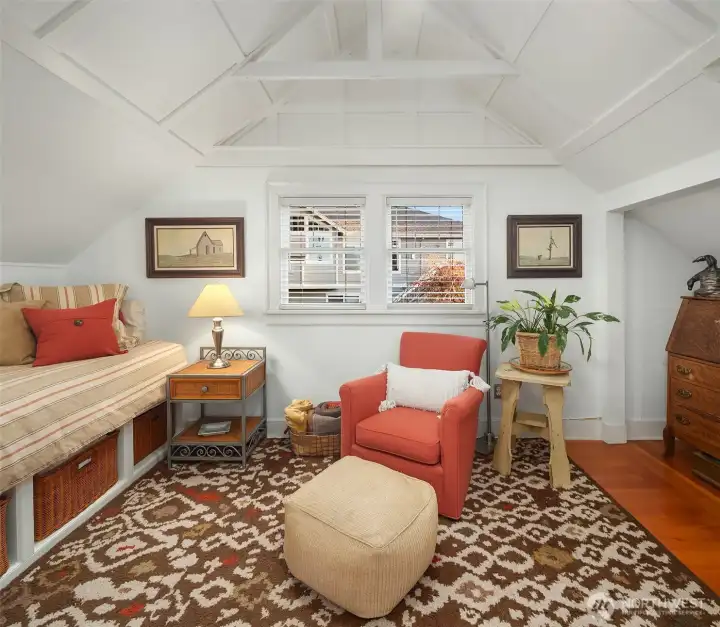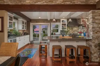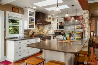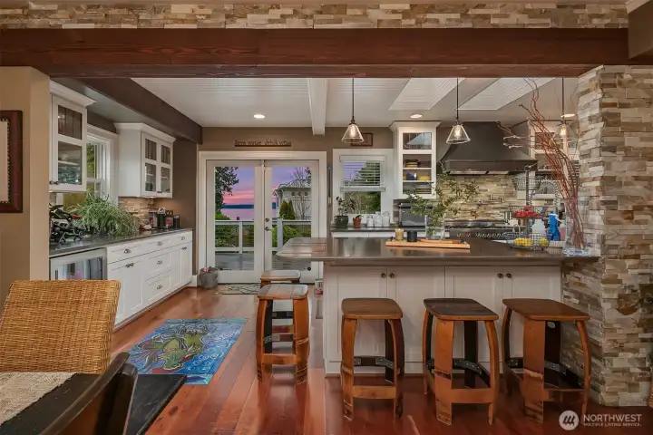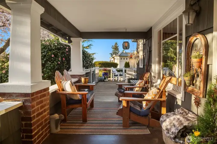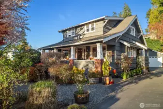 Privately nestled on coveted Olympic View Drive, this Edmonds view Craftsman with detached cottage offers the perfect blend of cozy charm and elevated luxury just moments from Edmonds Bowl. The 4-bedroom main home showcases an open-concept design with rich cherry hardwoods, exposed wood beams, stone cladding, shiplap accents, and beautiful millwork throughout. Designed for both everyday living and effortless entertaining, the gourmet kitchen features a farmhouse sink, wraparound island seating, 72" Sub-Zero, double ovens, 6-burner gas range with griddle, shaker-style cabinetry, and skylights that fill the space with natural light. Open the doors to the wraparound view deck and take in the setting. A wine cellar adds to the home’s thoughtful character, while the detached 2-car garage and charming cottage/ADU with full kitchen create exceptional flexibility for guests, multigenerational living, or potential income. Set on a generous .41-acre lot with a sprawling yard and inviting firepit area, this is a rare Edmonds property with space, warmth, and versatility.