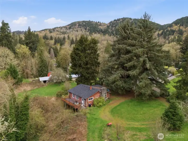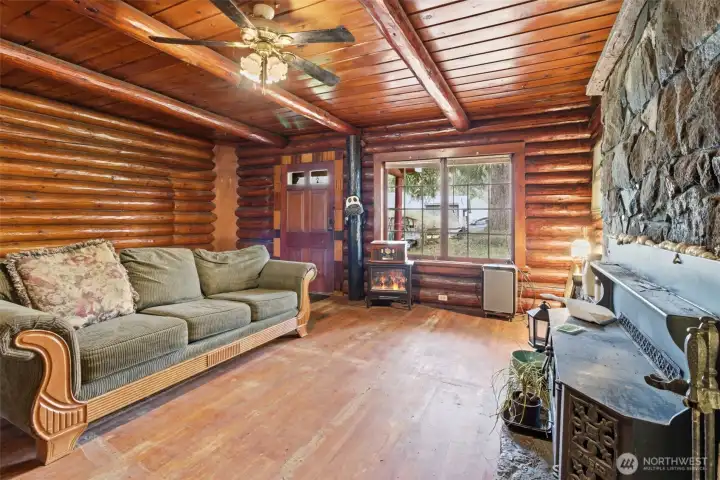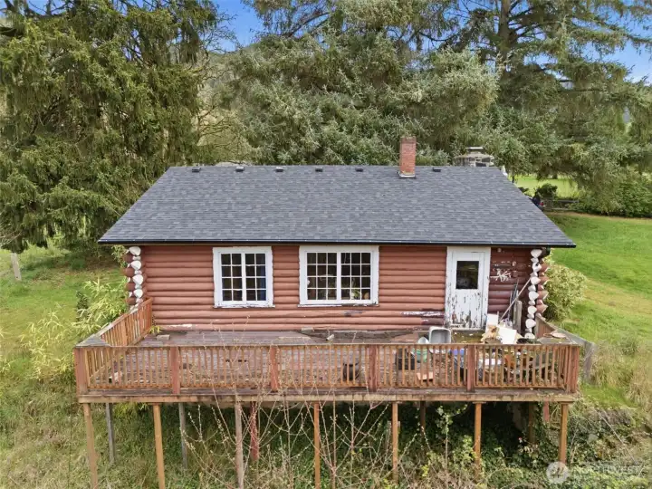 Opportunity awaits on 3.57 acres! This 2-bed, 1-bath log home is ready for your ideas and updates. Home features hardwood floors, kitchen with backyard access, and a dining room. The basement includes laundry and additional space. Property includes a deck, RV hookup, two large outbuildings, and fruit trees—ideal for those looking to create a hobby farm or invest in acreage with potential.