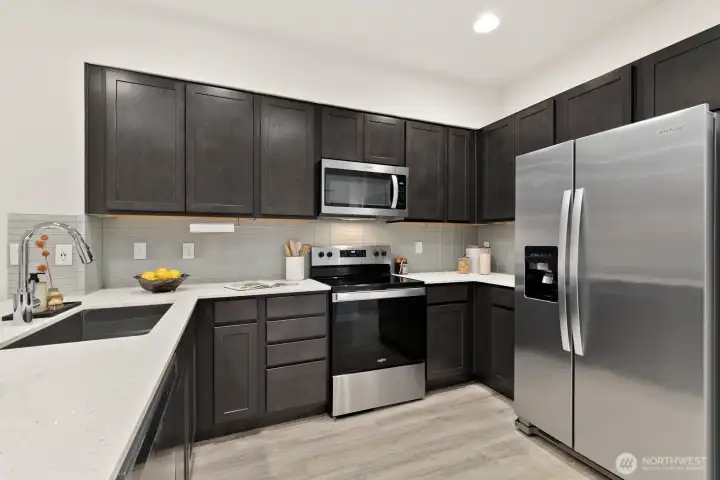 Welcome to The Parc – a sought-after South Everett community, just minutes from Mill Creek. This 2021 built home is better than new with fresh interior paint, new carpets, all kitchen appliances, washer / dryer and blinds! The thoughtfully designed floor plan offers 3 bedrooms, 2.75 baths and a spacious 2-car tandem garage with additional storage space. Enjoy modern finishes throughout, including quartz kitchen counters, sleek laminate flooring and efficient ductless mini-split system for year-round comfort. The main living area features open concept living at its best with a flexible living and dining space that opens to kitchen, perfect for everyday living and entertaining. Kitchen offers breakfast bar, ample storage space and large pantry! Rounding out the main living level is a bedroom + full bath, ideal for guests, office or flexible living. Upper level features a generous primary suite, overlooking peaceful green space, and offers two closet spaces + attached ensuite with dual vanities. Down hall is additional bedroom, full bath and laundry closet. This private community is tucked away, yet close to everything! Conveniently located near freeway access, shopping, dining, parks and medical services. Community trail connects directly to McCollum Park! Low HOA dues add to the appeal of this attached single-family-style townhome. This is the one you have been waiting for!
