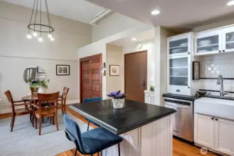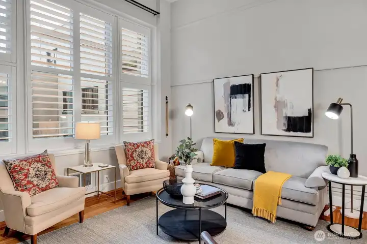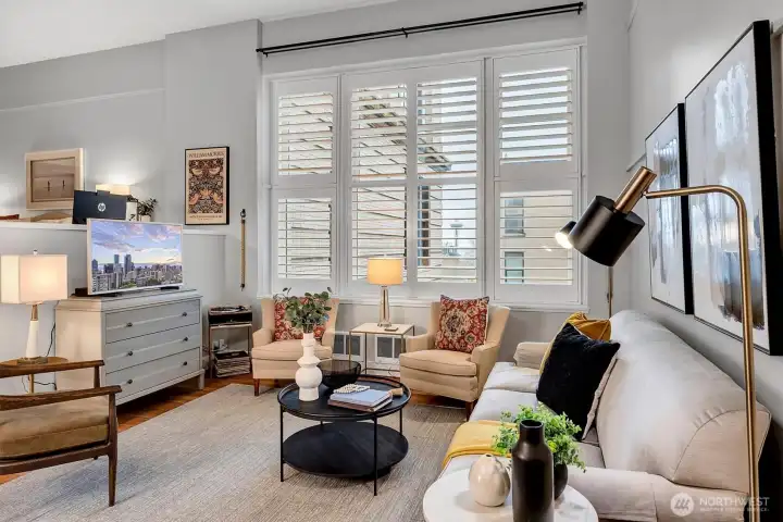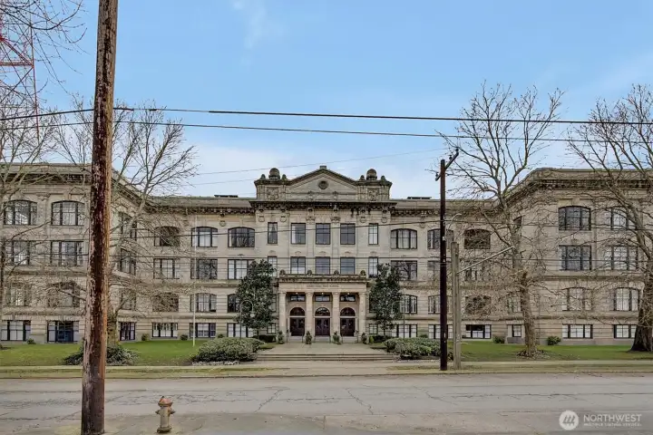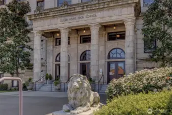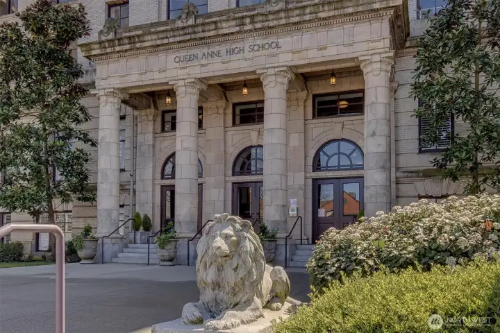 Own a piece of Seattle history at the iconic Queen Anne High School. This light-filled, open-concept 1-bedroom studio offers one of the best layouts in the building, with a rare view of the Space Needle. High ceilings and hardwood floors create an open feel, while the kitchen and classic tiled bath offer practical functionality. Free on-site laundry is just steps away, and a nearby storage unit adds extra convenience. The home also features new custom plantation shutters. The building sits atop Queen Anne Hill and includes a large rooftop deck with views of the city skyline, Puget Sound, and surrounding mountains. Amenities include an on-site manager, off-street parking, bike storage, and pet-friendly policies with no rental cap. Located just blocks from Queen Anne’s shops, restaurants, and services, this home offers a mix of historic character and everyday convenience.