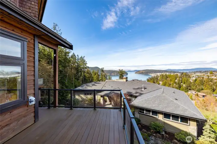 This luxurious custom home was thoughtfully designed for the amazing view out to Burrow's Bay, and Burrow's and Allen Islands. The gourmet kitchen features granite countertops, a large island, and high end stainless steel appliances. Don't miss the huge pantry and laundry area. The living room and dining room showcase the view with soaring ceilings and large windows to the West. Take in our gourgeous sunsets out on the deck off of the main living area and kitchen. The primary suite on the main floor also has access to a deck with views off to the West. The ensuite bath has a spa like feel with heated stone floors and a soaking tub. The upper level provides lots of flex space with two additional bedrooms, an office, and a bonus room. This one of a kind retreat nestles next to a forested area, providing lots of privacy while being a quick drive to ferry service, or downtown Anacortes. Washington Park is a five minute drive, and Deception Pass State Park is also close by. Seattle is about 1.5 hours away, and smaller airports in Everett and Bellingham are about an hour away.