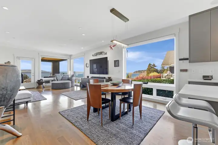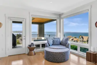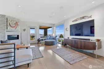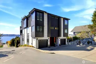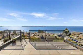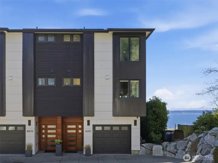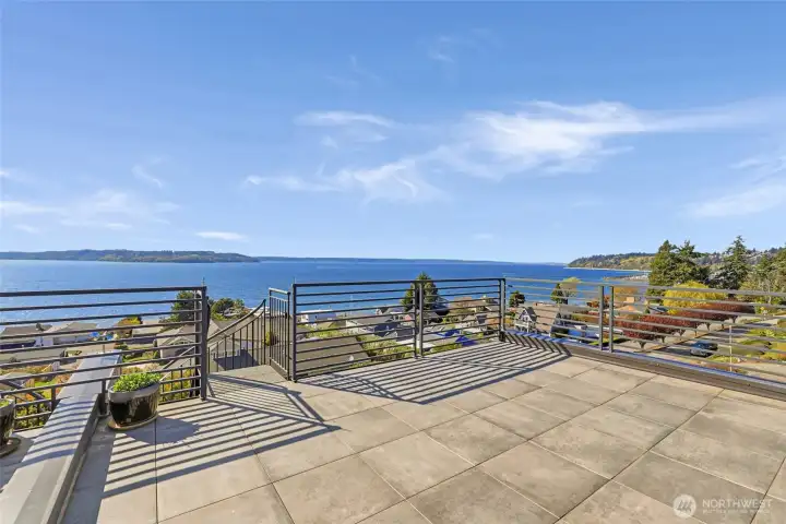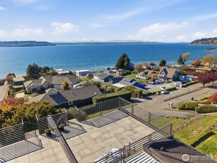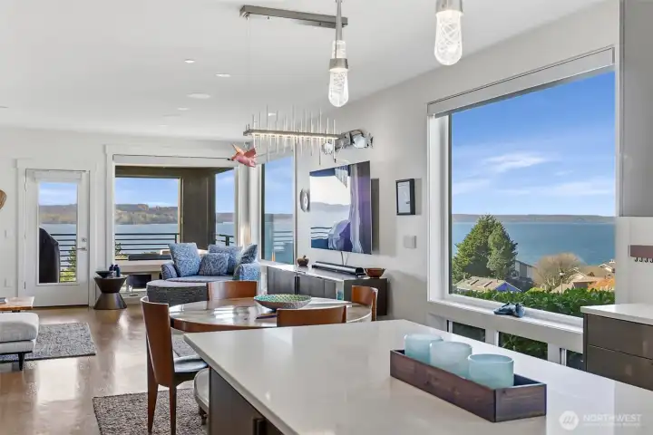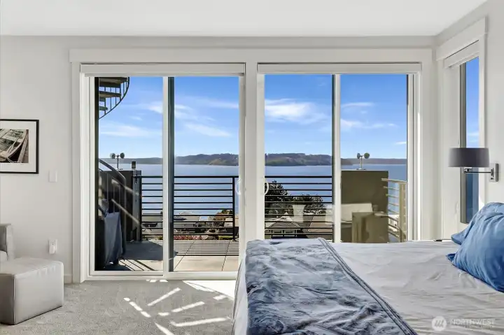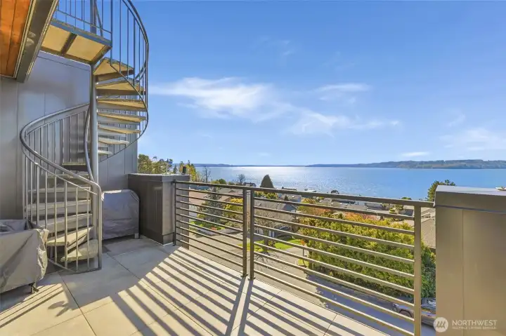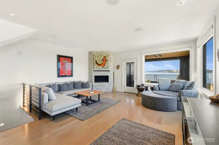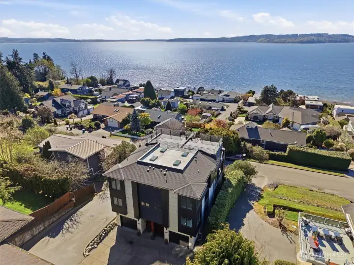 Welcome to luxury living in this exceptional view home. This stunning 2-bedroom, 2.25-bath townhome-style condo showcases breathtaking panoramic views of Puget Sound and the Olympic Mountains from nearly every vantage point. The open-concept main floor is thoughtfully designed with gorgeous hardwood flooring and a cozy gas fireplace, seamlessly connecting to a beautifully appointed gourmet kitchen featuring quartz surfaces, custom cabinetry, a Sub-Zero refrigerator, and high-end appliances. Expansive windows flood the home with natural light, while three private decks—including a covered main-level deck with infrared heating—provide the perfect setting to enjoy passing ships and unforgettable sunsets. The primary suite offers a true retreat with serene water views, a spacious bath, and private access via a spiral staircase to a spectacular rooftop deck. Additional highlights include a rare 2+car tandem garage, generous storage, central A/C, Hunter Douglas remote shades, and smart-home features. Extensively updated, including a full exterior reclad in 2019, this home blends timeless design with modern comfort in a private, quiet community.