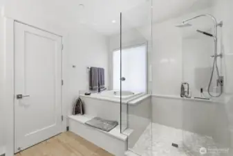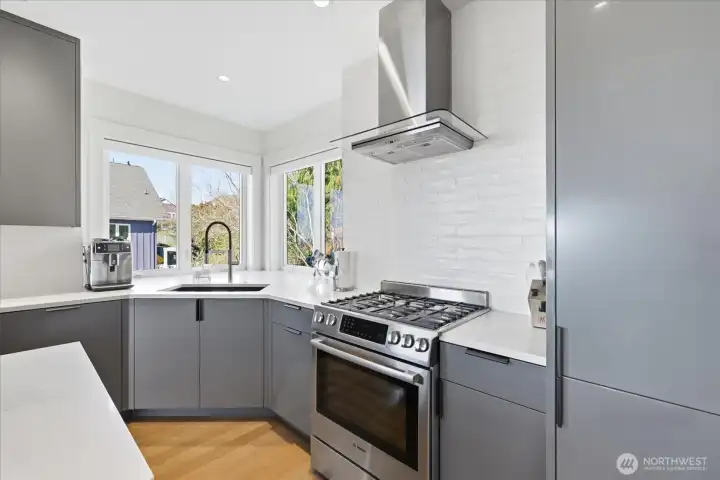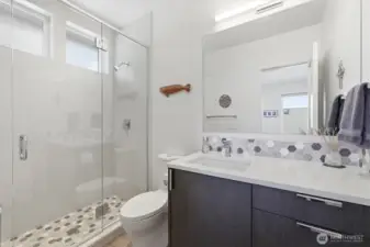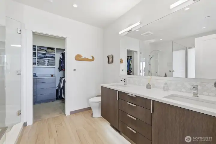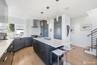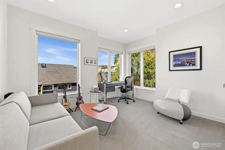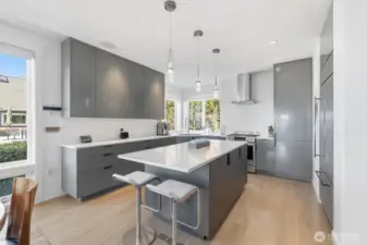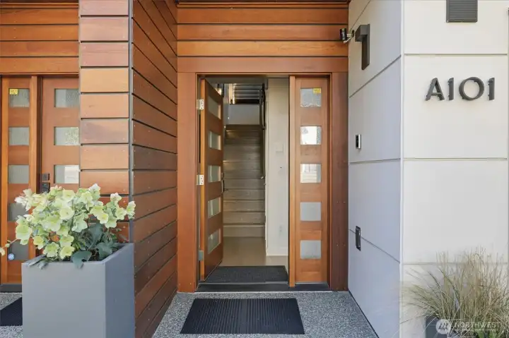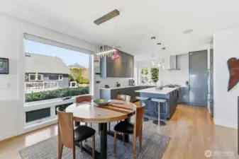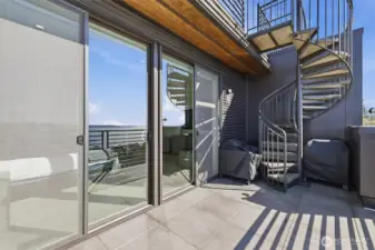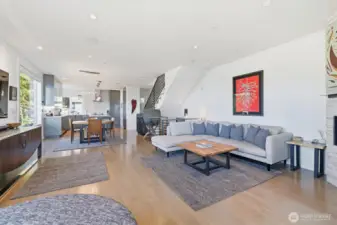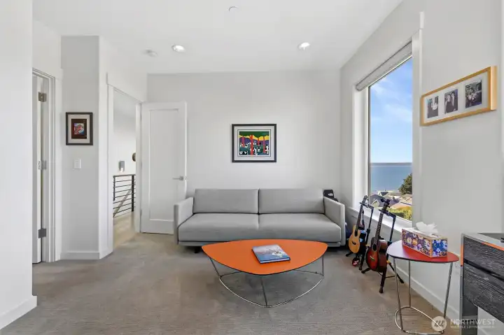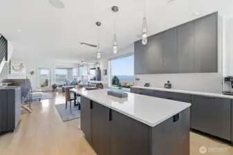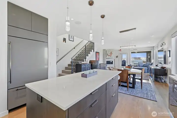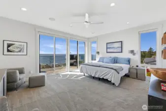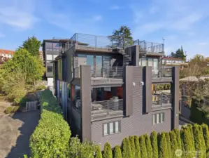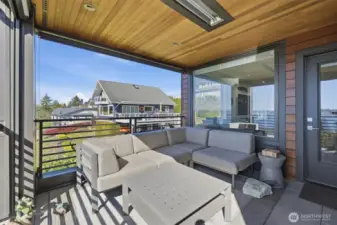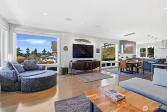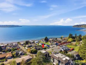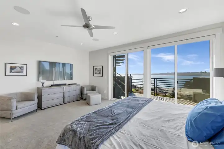 Welcome to luxury living in this exceptional view home. This stunning 2-bedroom, 2.25-bath townhome-style condo showcases breathtaking panoramic views of Puget Sound and the Olympic Mountains from nearly every vantage point. The open-concept main floor is thoughtfully designed with gorgeous hardwood flooring and a cozy gas fireplace, seamlessly connecting to a beautifully appointed gourmet kitchen featuring quartz surfaces, custom cabinetry, a Sub-Zero refrigerator, and high-end appliances. Expansive windows flood the home with natural light, while three private decks—including a covered main-level deck with infrared heating—provide the perfect setting to enjoy passing ships and unforgettable sunsets. The primary suite offers a true retreat with serene water views, a spacious bath, and private access via a spiral staircase to a spectacular rooftop deck. Additional highlights include a rare 2+car tandem garage, generous storage, central A/C, Hunter Douglas remote shades, and smart-home features. Extensively updated, including a full exterior reclad in 2019, this home blends timeless design with modern comfort in a private, quiet community.