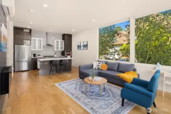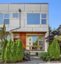 Exceptionally rare opportunity to own a townhome in Ballard with two dedicated off-street parking spots and a full ADU! The main floor entrance welcomes you into a great room with soaring ceilings and wrapped with windows. Venetian plaster accent wall surrounds the gas fireplace and the kitchen features quartz counters, gas range, custom cabinets and large island with eating space. Second level features a primary suite with spa-like bathroom including oversize walk-in shower, double sinks, and walk-in closet. Private and spacious rooftop deck with gas hookup and views of downtown. Lower level ADU is ideal for work-from-home, rental, or multi-generational living featuring full bath, kitchenette, and separate laundry. Walk score of 90!
