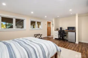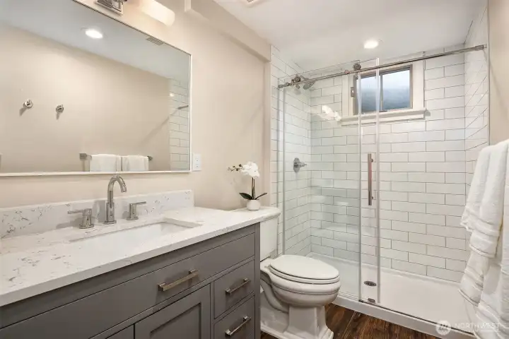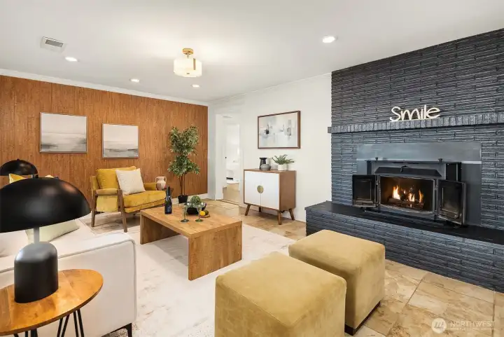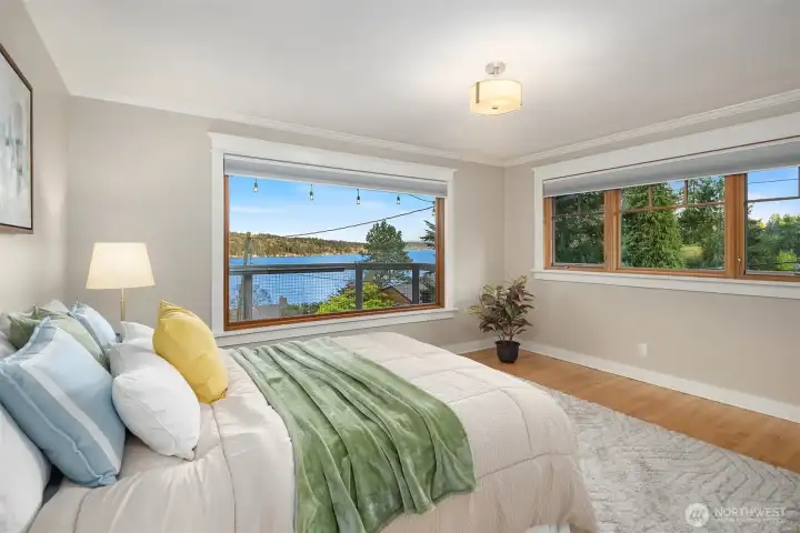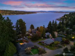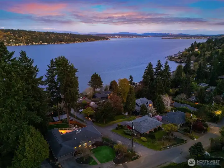The sun rises over Lake Washington as the warm glow streams through the windows and your day begins. At the end of the day, you unwind in the hot tub as you take in views of Mt. Rainier and the Bellevue skyline, and seaplanes make their graceful descent. This exceptional Cedar Park home was thoughtfully crafted so that whether you're working in the private office, lounging on the deck, or enjoying the fruits of your garden at the dining table, Lake Washington is always within your gaze. The main floor entry leads you to an open living and dining space anchored by a gas fireplace, flowing seamlessly into a kitchen with breakfast nook, and spacious pantry. French doors expand your living space to include a sprawling deck that puts the lake views front-and-center. The main floor primary offers two closets, including walk-in, and 3/4 bath with double sink vanity. Two additional large bedrooms and a full bath round out the floor. Downstairs, multi-purpose/rec room with wood fireplace, two additional bedrooms, 3/4 bath and large laundry/storage room complete the main home. A private guest suite with 3/4 bath and separate entrance as well as a dedicated office sit off the patio. Outside, a hot tub, sprawling deck, large lawn, and patio create an entertainer's dream. The garden overflows with an abundance of fruit trees, berries, vegetable beds and more. Just steps away you'll find beach access and the Burke-Gilman trail, making this not just a home, but a lifestyle.