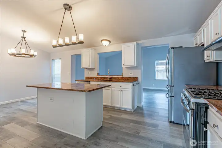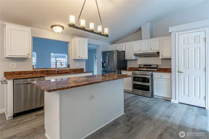 Absolutely stunning kitchen! To the left is the family room with covered patio access and to the right is the formal living space.