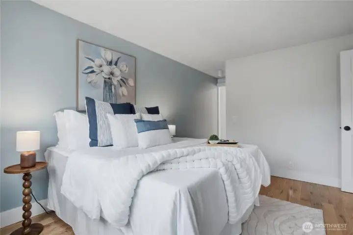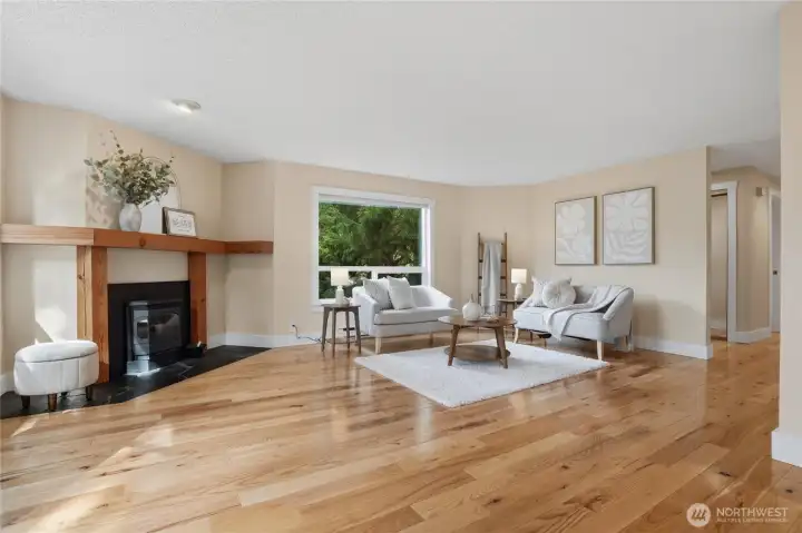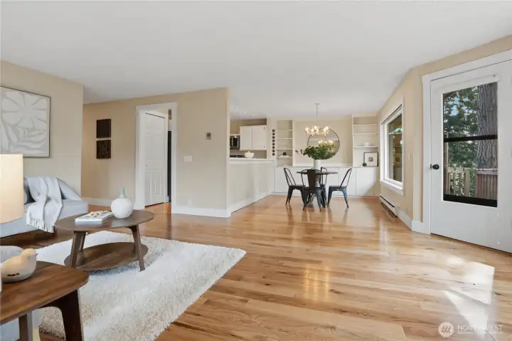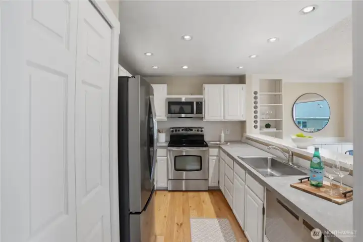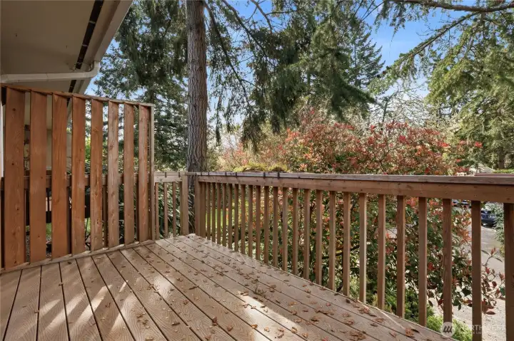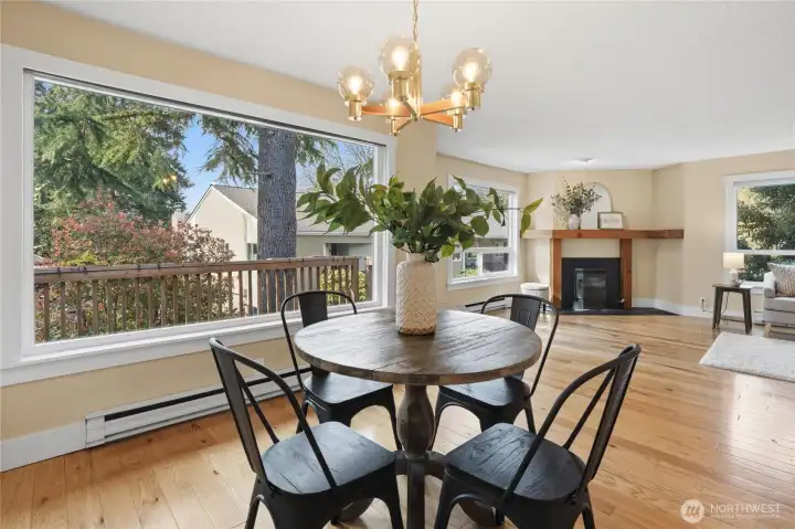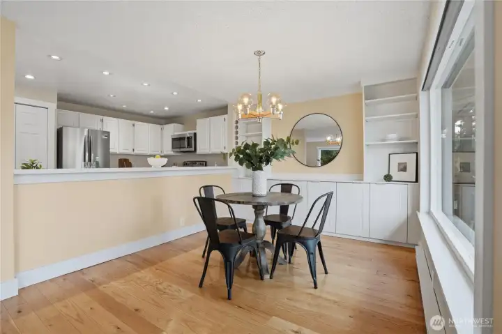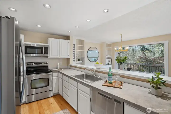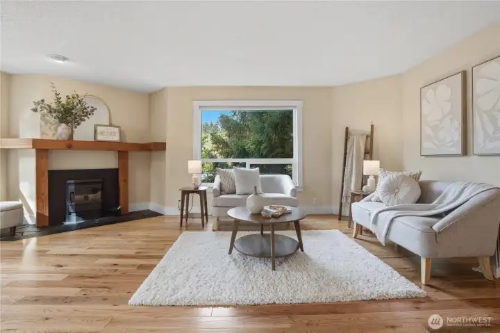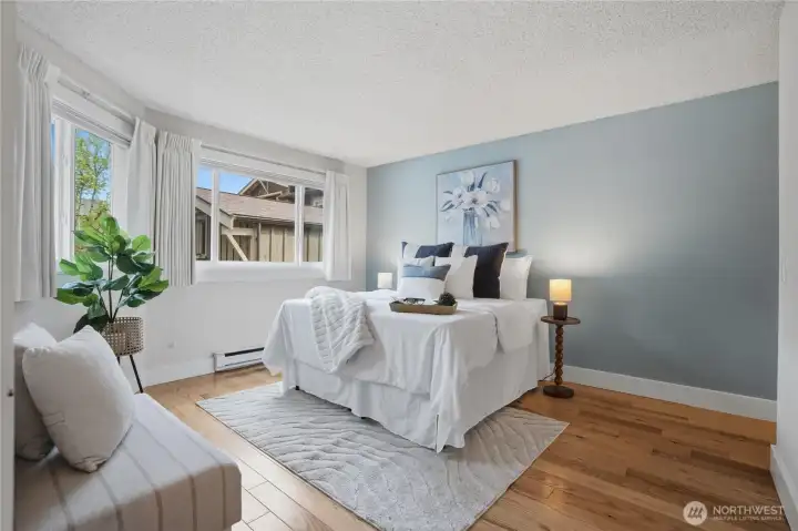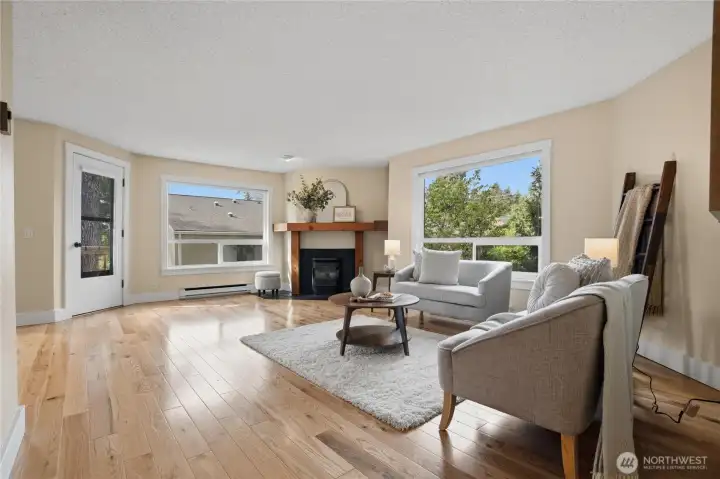 Welcome to your own private treehouse in the vibrant heart of downtown Bainbridge Island. Imagine living in a light filled three bedroom, two bathroom condo just steps from farmers market, movie theater, live theater, library, pool, restaurants, the ferry and everything urban island living has to offer. This end unit with windows on three sides, has an open plan south facing kitchen, dining, and living room, equally suited for entertaining or savoring a warm cup of coffee. Watching the songbirds from your perch above the lush park like grounds. A pellet stove with a modern wood mantle beckons during chilly Northwest winters. Gleaming hardwood foors flow throughout leading to a spacious primary suite with new blackout shades, a walk-in closet with organized shelving and storage and renovated en suite bath with natural stone floors. Solar tubes flood the spaces with warm day lighting. In unit washer and dryer, a private balcony for dining alfresco, and two dedicated covered parking spaces with locked storage round out this beautifully appointed, bright, cheerful home, “immerse yourself neighborhood Brimming with fantastic amenities”
