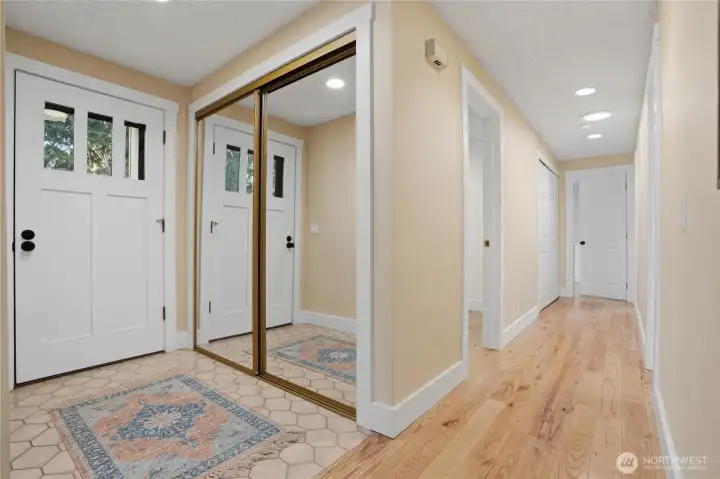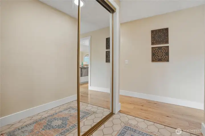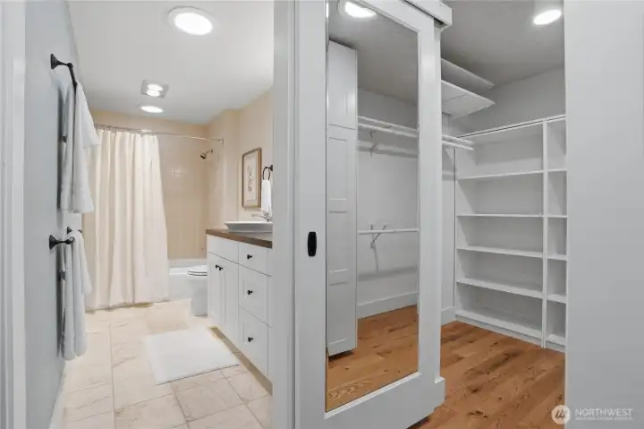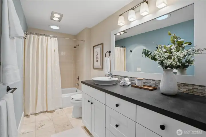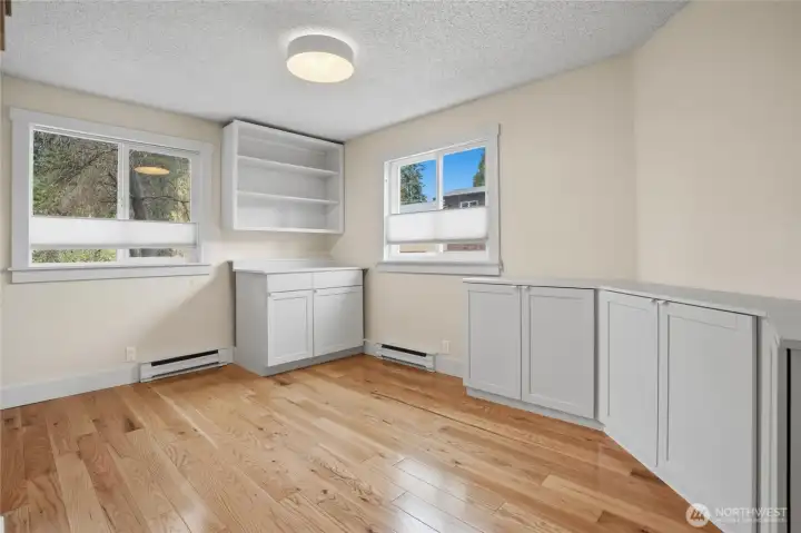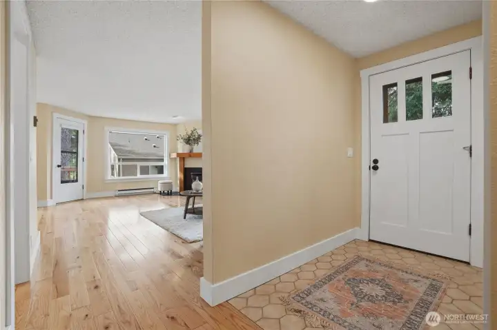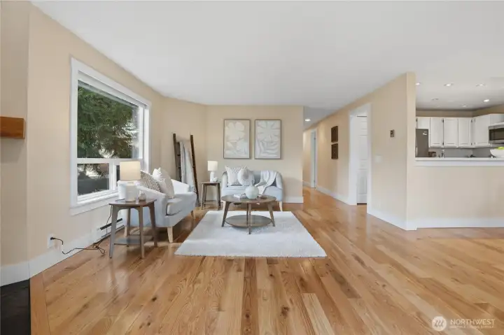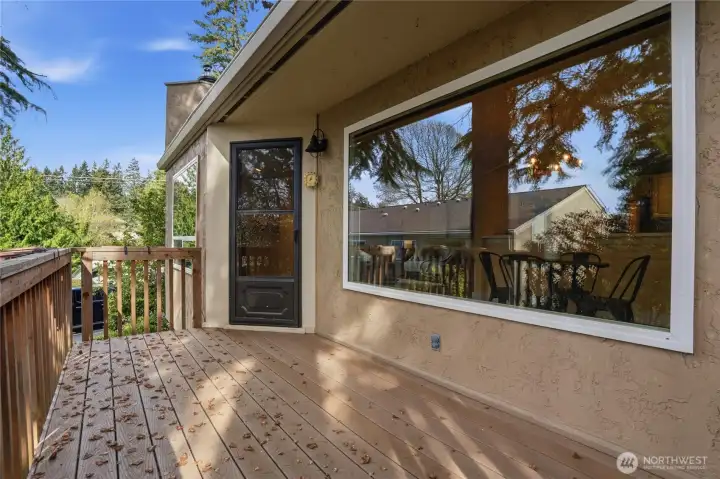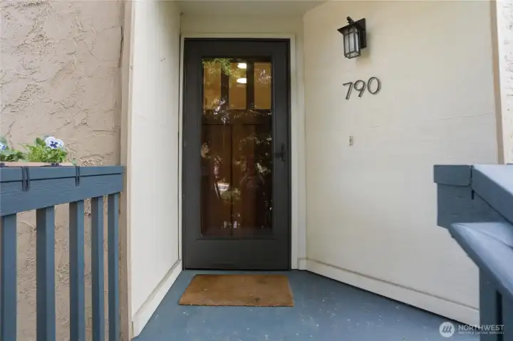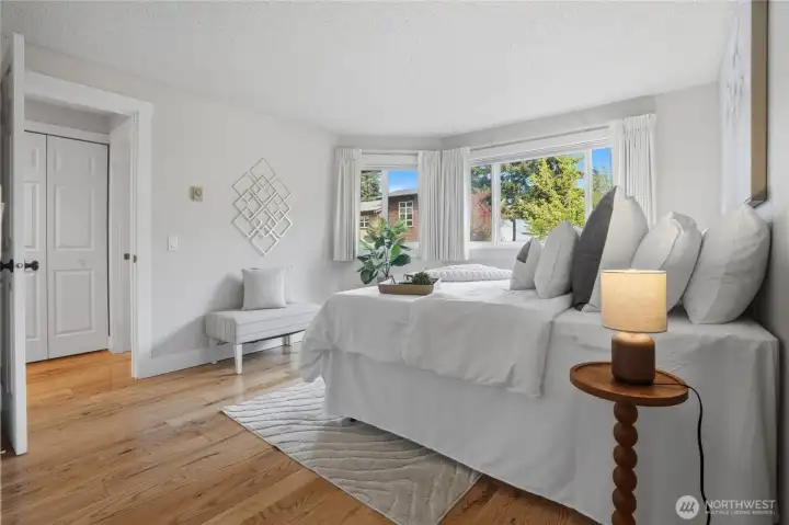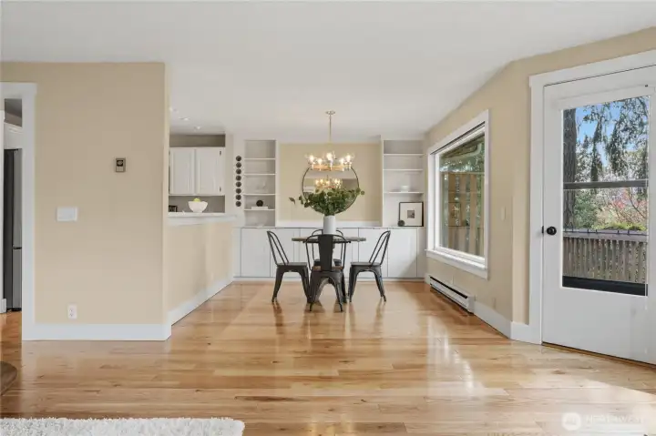Welcome to your own private treehouse in the vibrant heart of downtown Bainbridge Island. Imagine living in a light filled three bedroom, two bathroom condo just steps from farmers market, movie theater, live theater, library, pool, restaurants, the ferry and everything urban island living has to offer. This end unit with windows on three sides, has an open plan south facing kitchen, dining, and living room, equally suited for entertaining or savoring a warm cup of coffee. Watching the songbirds from your perch above the lush park like grounds. A pellet stove with a modern wood mantle beckons during chilly Northwest winters. Gleaming hardwood foors flow throughout leading to a spacious primary suite with new blackout shades, a walk-in closet with organized shelving and storage and renovated en suite bath with natural stone floors. Solar tubes flood the spaces with warm day lighting. In unit washer and dryer, a private balcony for dining alfresco, and two dedicated covered parking spaces with locked storage round out this beautifully appointed, bright, cheerful home, “immerse yourself neighborhood Brimming with fantastic amenities”