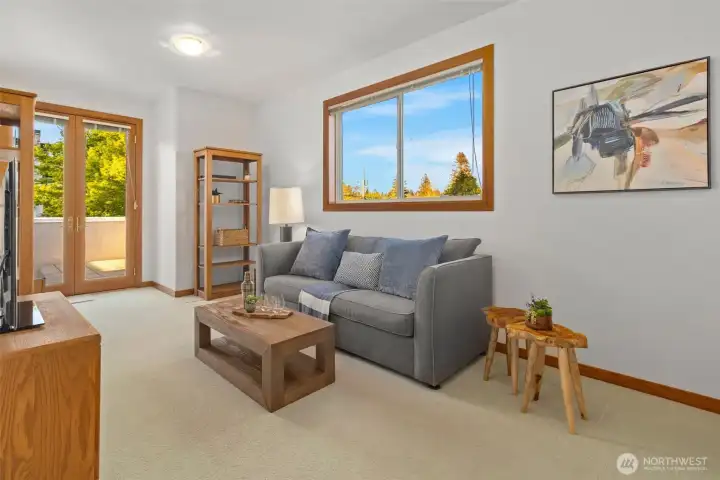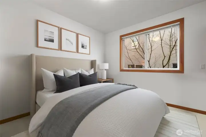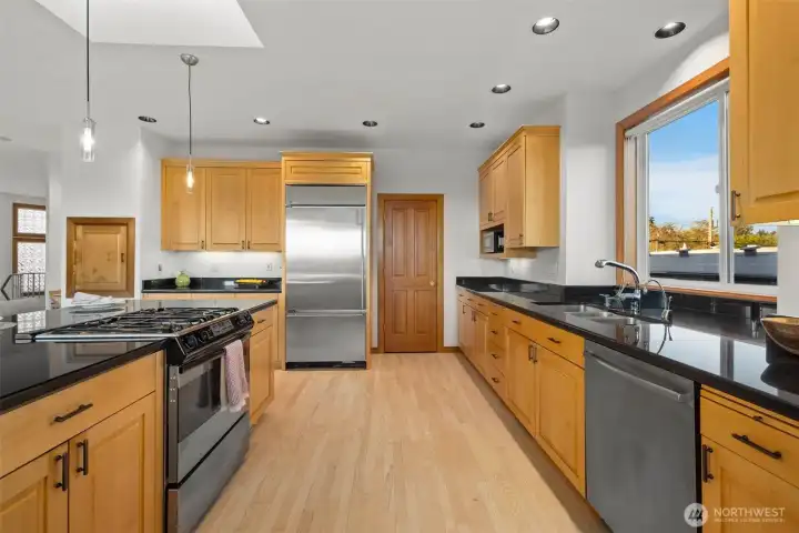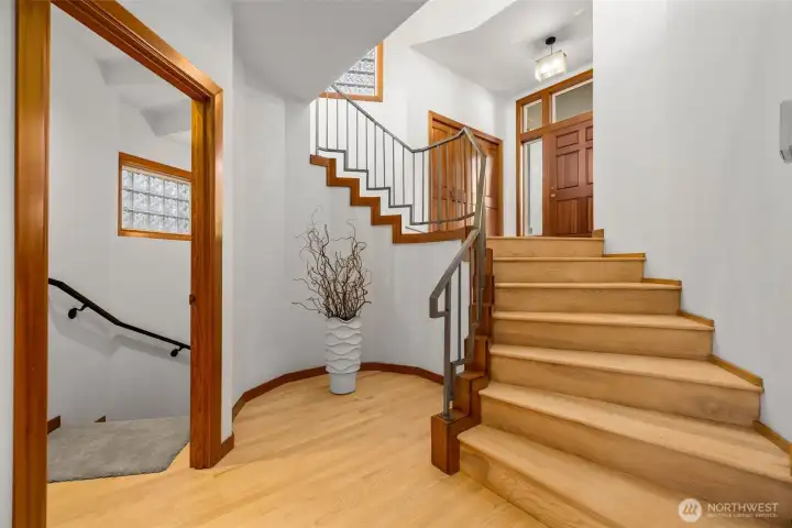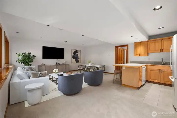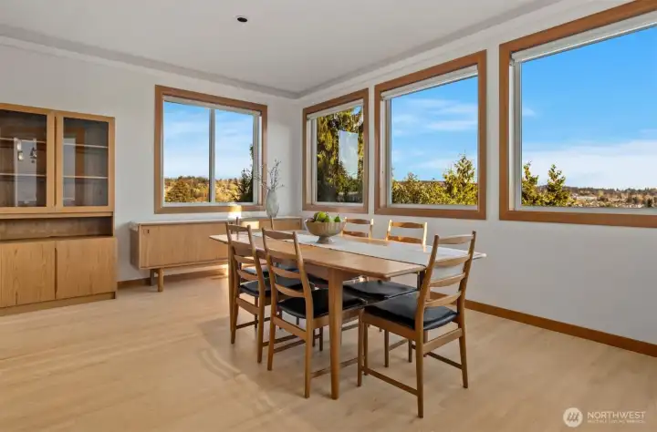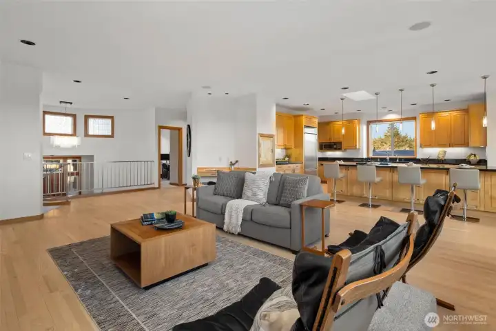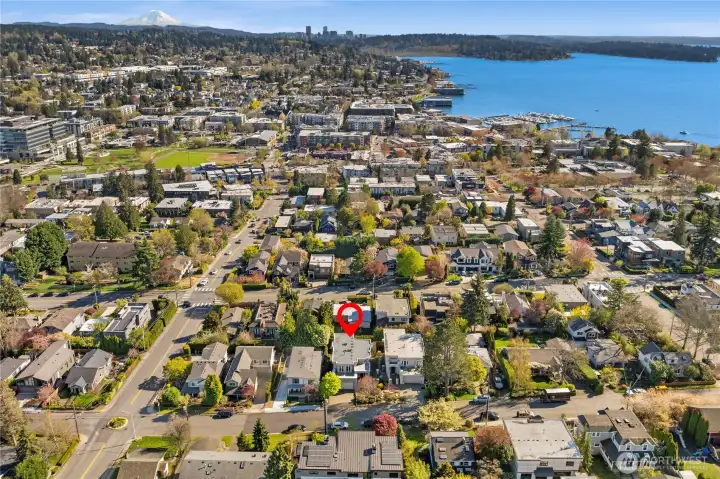 Set just above charming downtown Kirkland, this 6 bedroom Northwest Contemporary offers a sense of ease from the moment you arrive, with soft natural light, clean lines, and glimpses of Mt. Rainier, the Bellevue skyline, and surrounding greenery. Life unfolds naturally on the main level, where rich hardwood floors lead you through open yet defined spaces designed for gathering and day to day living. The kitchen becomes the natural place to linger, anchored by alder cabinetry and generous workspace, with a thoughtful connection to both dining and living areas. Whether hosting friends or enjoying a quiet evening, the flow feels intuitive, extending effortlessly to the balcony where sweeping views create a memorable backdrop. Just beyond, additional living spaces offer flexibility, making it easy to shift between work and connection throughout the day. The main level primary suite is set apart, offering a quieter place to unwind, with a spa-like bath that encourages a slower pace. Three additional bedrooms and a well-placed laundry room complete the level with everyday convenience. Downstairs, the home opens up to even more possibility, with space that can evolve into a private ADU or remain as an extension of the home for guests, longer stays, or multi-generational living. Thoughtfully designed and easy to live in, this home balances openness with privacy, all within moments of parks, beaches, and the energy of downtown Kirkland.