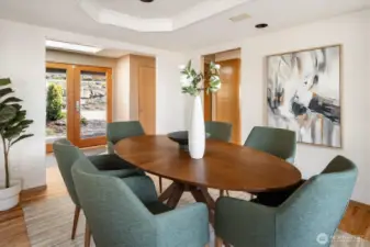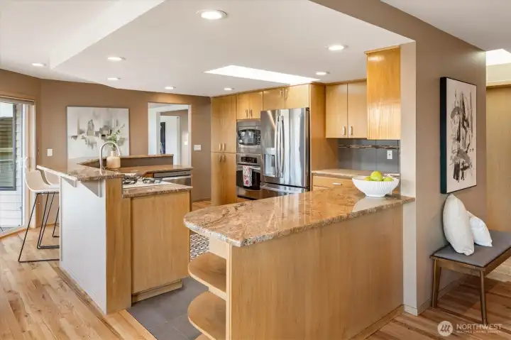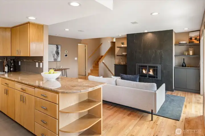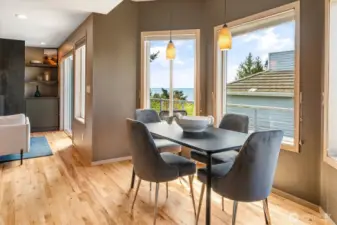 This stunning Northwest Contemporary home showcases Puget Sound and Olympic Mountain views from every level. An inviting main-floor entry welcomes you into a light-filled living room with vaulted ceilings and a wood-burning fireplace, seamlessly flowing into a spacious dining room, perfect for both intimate gatherings and larger entertaining. The layout continues into a Chef’s kitchen with plenty of counter space and an eating nook and a cozy family room featuring a custom gas fireplace. From there head out to the large deck, which invites you to sip morning coffee or host sunset barbecues while soaking in the scenery. Upstairs, the serene primary suite features vaulted ceilings, a private view deck, gas fireplace, luxurious five-piece bath and a generous walk-in closet. The adjacent bedroom with it's own private en-suite bathroom, providing comfort and privacy for guests or household members. The lower level offers two additional bedrooms and a third full bathroom, and a comfortable family room with access to another view deck overlooking a tranquil stream. An attached three-car garage provides plenty of room for parking, storage, hobbies...or all three. The professionally landscaped yard is filled with seasonal beauty to enjoy throughout the year. Located in the highly sought-after Shoreline School District. Just moments from The Saltwater Park, the historic Library and the Richmond Beach Town Center. Welcome home to true Pacific Northwest living!