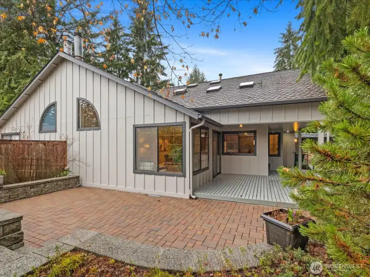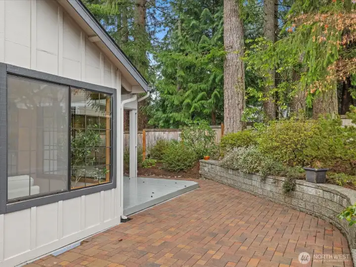 Private fenced backyard with brick paver patio, covered deck, and towering Pacific Northwest trees — a rare outdoor retreat in a condominium community