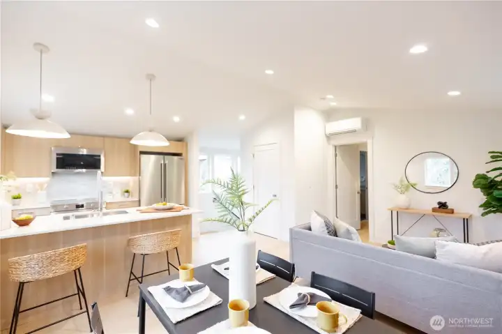 Welcome to this community of three newly built modern homes in Seattle’s vibrant Central Area, crafted by Bungalow Building. Thoughtfully designed with contemporary living in mind, each home features an open-concept floor plan, premium finishes, and dedicated off-street EV-capable parking. This two-story, 1,073 sq ft detached residence offers a main-level entry featuring two bedrooms, a full bath, laundry closet, and a sliding glass door to access a private patio. Upstairs, the second level includes an open living and dining area, a U-shaped kitchen with a large peninsula quartz countertop, modern Bellmont cabinetry, stainless steel appliances/induction range. This floor also features the primary suite with a walk-in closet and full bath. High-end details throughout include engineered wide-plank oak flooring, smooth wall finish, custom tilework, frameless glass showers, private outdoor space, and energy-efficient mini-split heating and A/C on all floors. Ideally located just minutes from downtown Seattle, Capitol Hill, the Arboretum, and Madison Park, with easy access to neighborhood cafes, markets, and major commuting routes. Schedule a tour today! Walkscore 77. 4-star built green certificate pending.
