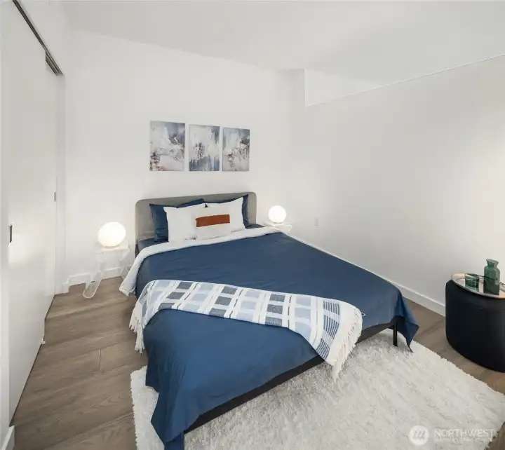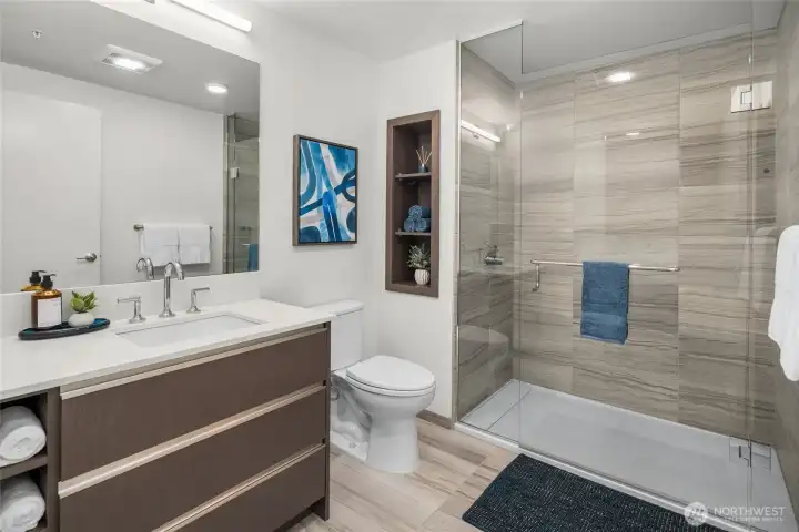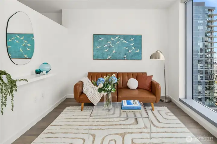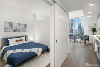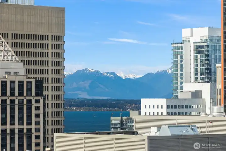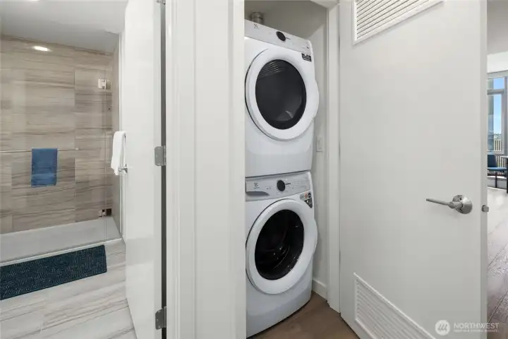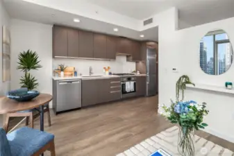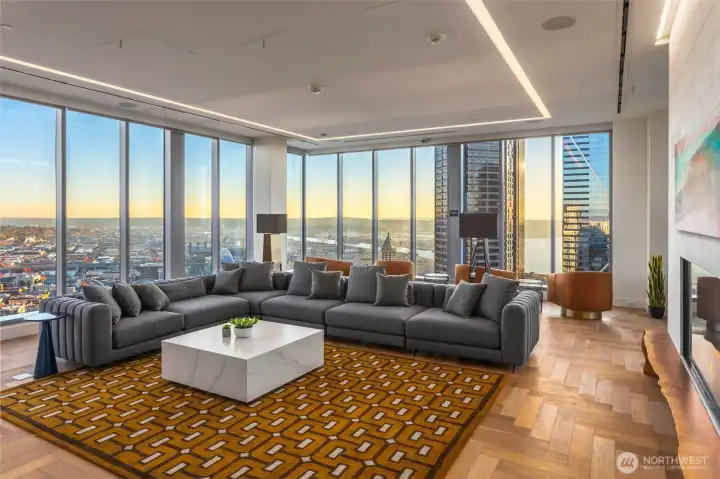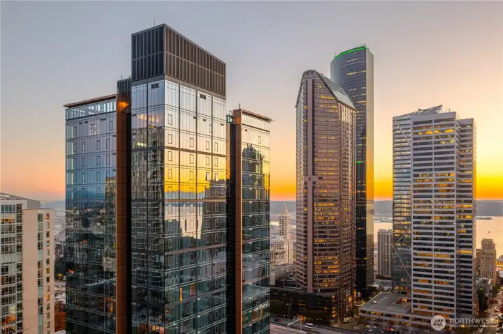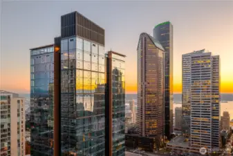 Experience modern city living in this west-facing open one-bedroom at The Graystone, one of Seattle’s newest high-rise residences. Built with premium curtain wall construction, the home is filled with natural light and showcases sweeping views of the Seattle skyline, Smith Tower, Elliott Bay, and the Olympic Mountains. The galley kitchen features Bosch appliances, a gas cooktop, and ample storage. The open-concept layout offers flexible living and sleeping space, complemented by a deep closet for additional storage. Includes a full-size stacking Electrolux washer and dryer. The bathroom features a sleek standing glass shower. Residents enjoy 24/7 concierge service, a fitness center overlooking the waterfall park, a co-working level, and a video game lounge. Graystone showcases one of Seattle’s few fully integrated 360-degree rooftop amenity spaces, featuring NanaWall systems that open seamlessly into expansive outdoor areas. The rooftop offers panoramic views from Mt. Baker to Mt. Rainier, the Cascades to the Olympics, Elliott Bay, South Lake Union, Lake Washington, and Downtown Bellevue.