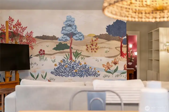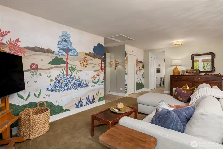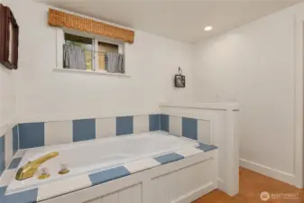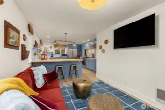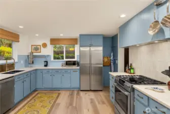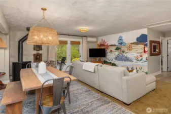 Nestled on 1.23 acres of peaceful, woodsy surroundings, this charming garden cottage-style home offers a rare blend of character and comfort. High ceilings and an open-concept living, dining, and kitchen area create an airy, inviting atmosphere, while a cozy propane stove adds warmth and ambiance. The home is filled with personality, showcasing eclectic yet tasteful finishes throughout. The kitchen shines with stainless Bosch and Samsung appliances, ample cabinetry, and a unique combination of subway tile and wood panel backsplash. Step outside to enjoy beautifully curated gardens, complete with a trellis and winding pathways, or relax on one of two decks—one opening through French doors to a serene patio overlooking native landscaping. The main level features a bedroom with adjacent full bath and tiled shower, while upstairs, the primary suite offers a thoughtful layout, full ensuite bath, and walk-in closet. Located just across the street from shoreline access and recreation at Fay Bainbridge Park, this home is a tranquil retreat with everyday convenience in a truly special setting.