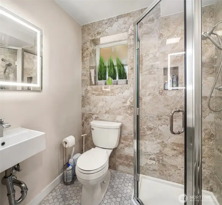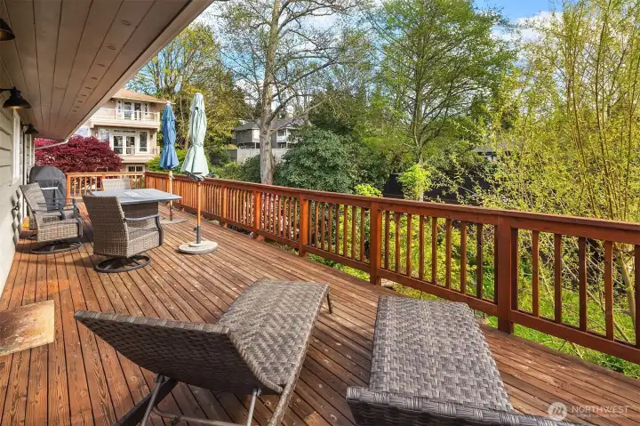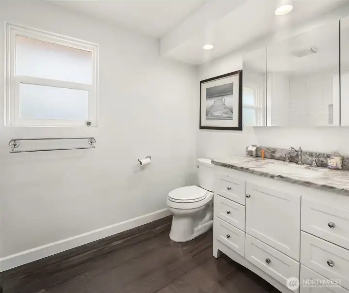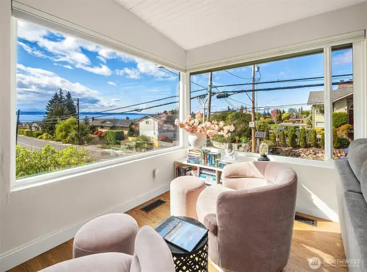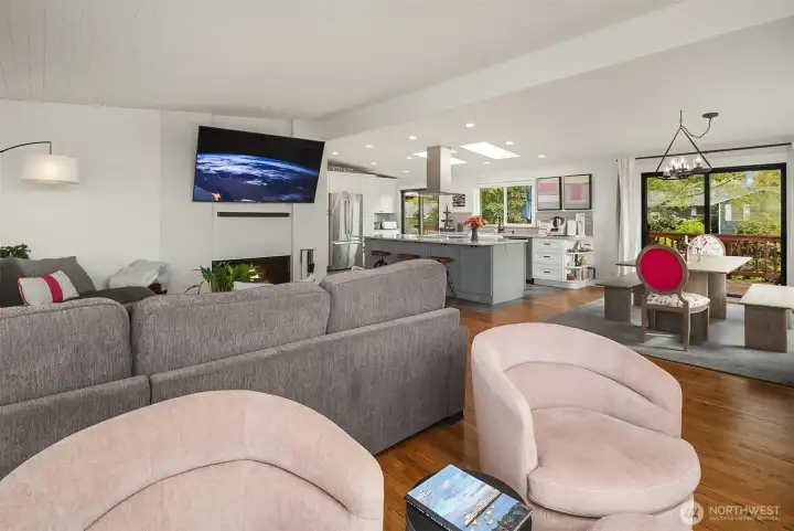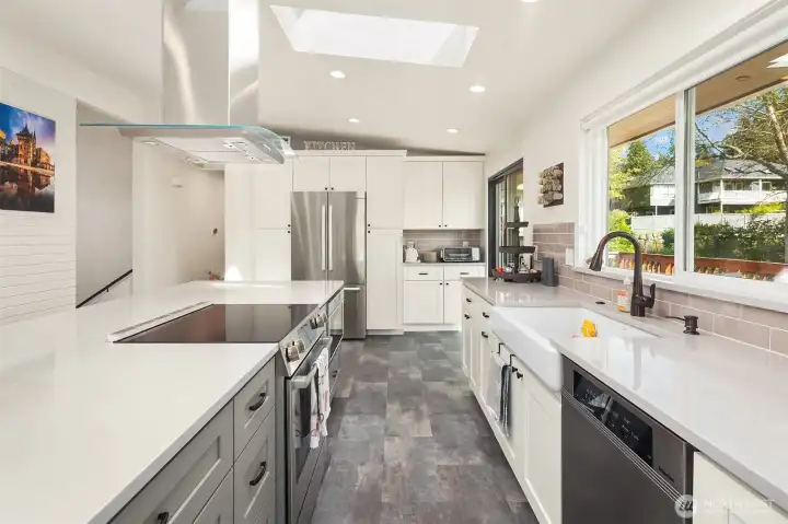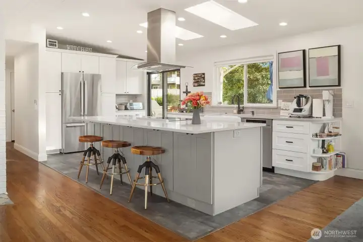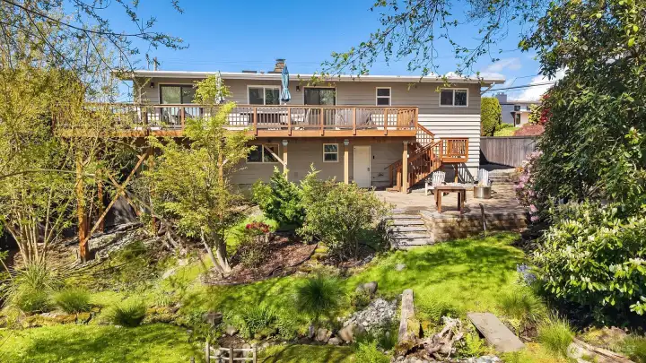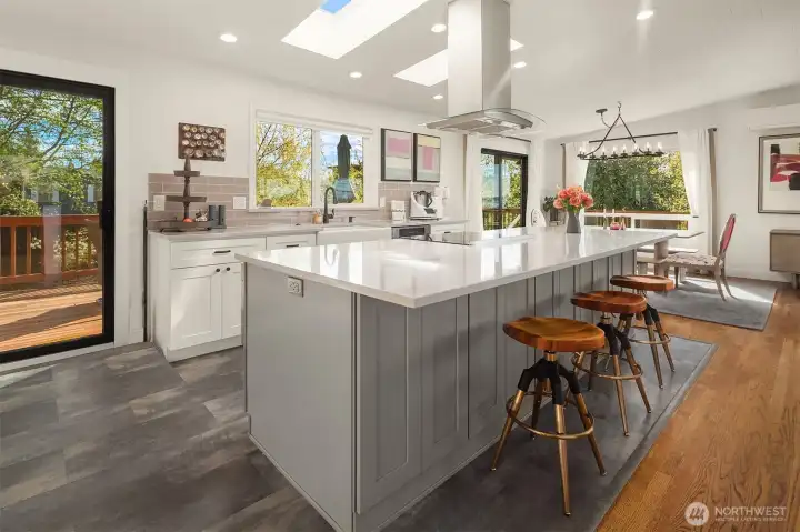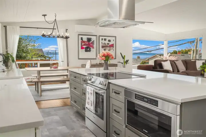 In the heart of Edmonds Bowl offering Olympic Mountain and Puget Sound views, sits this beautifully updated 4-bedroom, 1.75-bath home. The split-entry design welcomes you upstairs to a fully remodeled kitchen featuring grey quartz countertops, a slate grey island with built-in microwave and Bosch electric range, a farmhouse sink, skylights, and walls of windows that fill the space with natural light. The interior has been completely repainted, offering a fresh, move-in-ready feel. Off the kitchen is the dining area and living room with a brick wood-burning fireplace. The primary suite is conveniently located on this floor with a full ensuite bathroom. Two additional bedrooms complete this level. Downstairs features new LVP flooring and a spacious rec room with a stacked stone wood-burning fireplace. A bedroom and ¾ bath along with the laundry room are also conveniently located downstairs. Step outside to an expansive deck ideal for gatherings. Walk down the deck to the patio and enjoy the lush backyard. Unbeatable location with easy access to the ferry, waterfront, and all the shopping and dining that Edmonds has to offer.