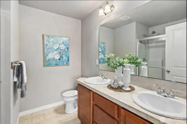 Beautifully maintained 2 bed 2.5 bath townhome over 1300 sq ft with fresh interior paint and brand-new LVP flooring throughout the main living areas. Rare opportunity to assume an ultra-low 2.87% APR loan, subject to lender approval. This home offers 2 car garage, a private balcony/deck. Stylish kitchen with granite tile countertops, stainless steel appliances, gas range, breakfast bar, and open-concept family and dinning room. Upper level includes laundry, a spacious primary suite with attached 3/4 bath, dual vanities, and plenty of closet space. A second bedroom with its own full bath. Oversized 2-car tandem garage with storage, extra driveway parking, and ample guest parking. HOA maintains exterior, landscaping, common areas, and roof. Great Bothell location near shopping, parks, daycare, commuter routes, and top-rated schools. No rental cap. Home is virtually staged and may differ from actual appearance.
