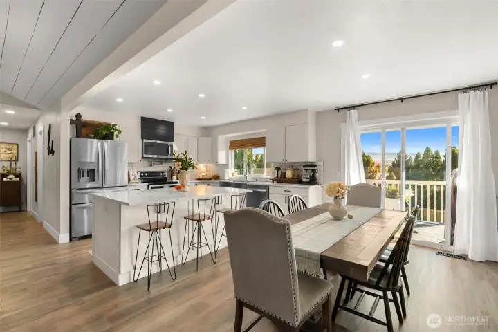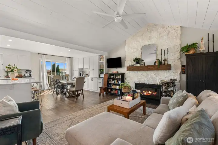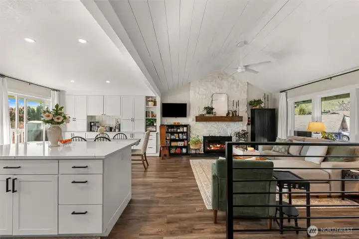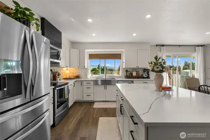 Completely remodeled from top to bottom, this stunning two-level home offers modern comfort and timeless style in an unbeatable location. Tucked at the end of a quiet cul-de-sac in the center of Wenatchee, you’ll enjoy both privacy and convenience. Step inside to beautifully updated living spaces featuring an open-concept kitchen, dining, and living area perfect for entertaining. The living room showcases a striking floor-to-ceiling rock fireplace, creating a warm and inviting focal point. The kitchen shines with crisp white cabinetry, solid surface countertops, and a spacious island. The main level includes three bedrooms, highlighted by a comfortable primary suite with an updated en-suite bathroom. Downstairs, you’ll find a generous bonus room with custom built-in cabinetry, plus a fourth room ideal as a bedroom, office, or flexible living space. Outside, enjoy a fully fenced yard, charming garden area, expansive shed/shop, gate to neighboring school and a lovely view deck, perfect for relaxing or entertaining. The garage is also extra deep making room for storage or even shop space. RV parking on the side of the home makes it easy to keep your recreational toys at home. This move-in-ready home truly has it all. Step inside and make it your own!