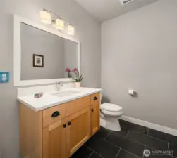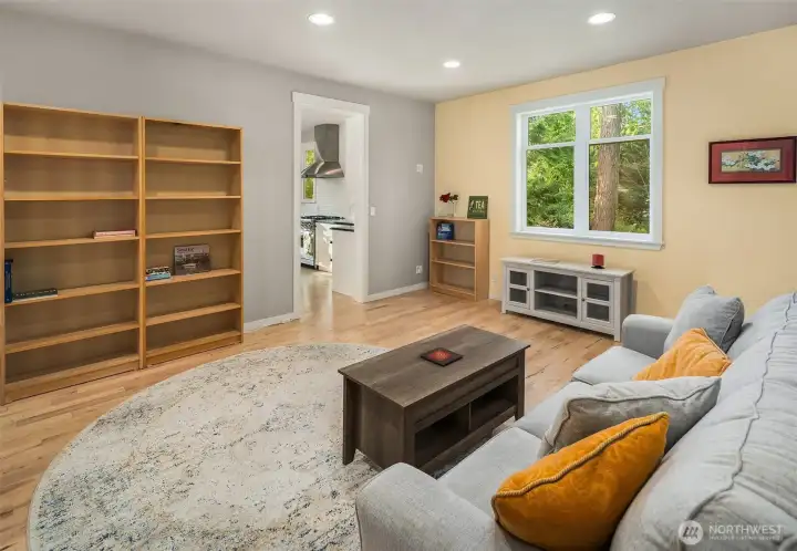 Beautiful, elegant, light filled modern Craftsman home on a sunny, level, landscaped .6 acre lot, close to Winslow. Outstanding, flowing floor plan, with hardwood floors throughout the main level. Chef's kitchen with quartz counters, stainless appliances, excellent work surfaces and storage. Charming living room with fireplace and large front windows, dining area with french doors to the patio. Main floor family room, & a large office with a separate entrance. Luxurious principal bedroom suite features marble counters, free-standing tub, and generous walk-in closet. 2 additional bedrooms with walk-in closets upstairs and another full bathroom. Radiant floor heating in bathrooms, efficient mini splits for heating and cooling. Outside there is a lovely mature garden, with plenty of space for vegetables, flowers, an orchard, or a play space. Dead end street, quiet and secluded. This is a wonderful home!