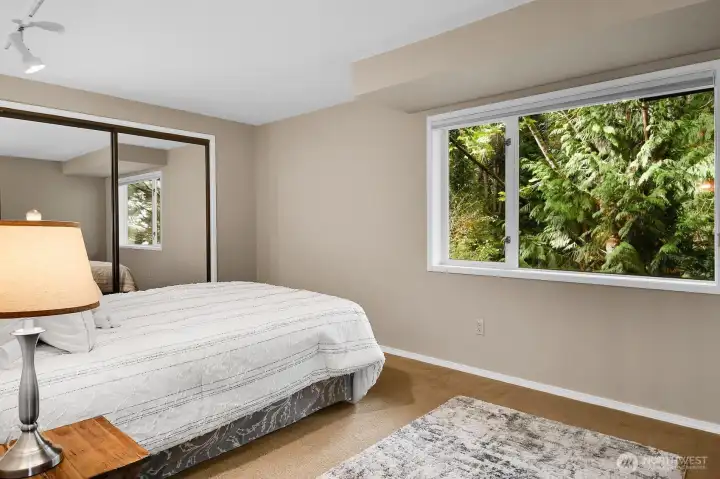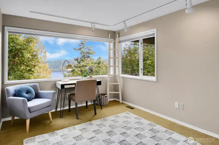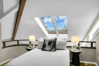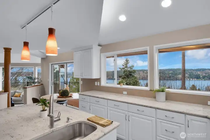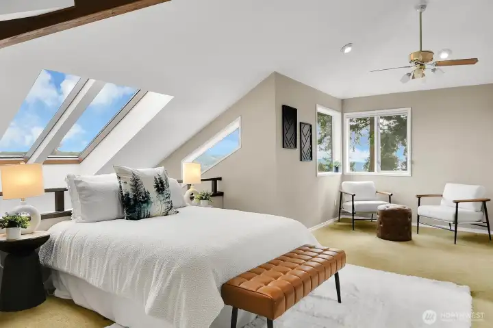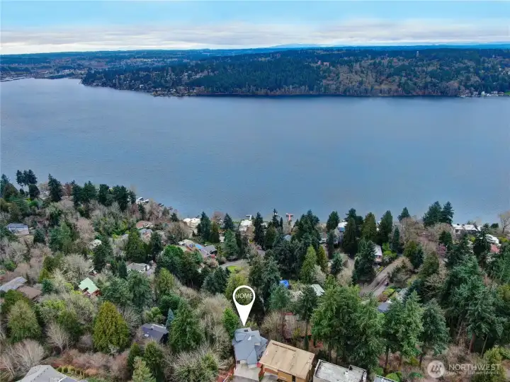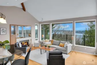 Perched high above Lake Washington, this urban “Tree House” offers a rare blend of secluded privacy and breathtaking panoramic vistas of the lake and mountains. Originally honored as a Seattle Times/AIA Home of the Month, the residence features soaring ceilings and expansive window walls designed to immerse you in nature. The open concept main level is built for entertaining, boasting hardwood floors and a spacious kitchen that flows into living and dining areas, all opening to a newly constructed view deck. Retreat to the top-floor primary suite, a private sanctuary complete with a remodeled bath, walk-in closet, and personal sauna. The lower level provides versatile living space with three additional bedrooms and a large game/media room anchored by a cozy gas fireplace. Outside, tiered garden space and a covered patio offer endless possibilities. Two car garage with ample loft storage for all the toys. Situated at the end of a quiet street with easy access to the Burke-Gilman Trail. A true “In City Retreat”!