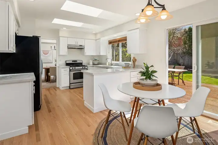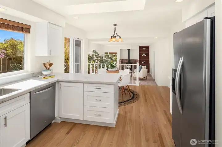 Welcome to your next chapter! This home lives large! Fantastic layout with vaulted ceilings and south facing back yard lets the light pour in. Brand-new kitchen with white cabinets, quartz counters, stainless appliances and eating space flow easily into the gathering room and open to the yard. Perfect for everyday living and entertaining. 3 remodeled baths, 4 bedrooms, fresh paint, trim and doors make this home move in ready. Primary bath includes marble shower, counters, heated floors and dual walk in closets. Spend the summer in your backyard, entertain on the deck that is plumed for a gas BBQ, enjoy the hot tub, custom play house, landscaping includes raised beds, pear trees and blueberry bushes. Fully fenced yard includes area beside the garage that is perfect for a boat. Pre-inspected and move-in ready with easy access to everyday amenities. Warm and inviting Northwood neighborhood includes 4th of July parade.
