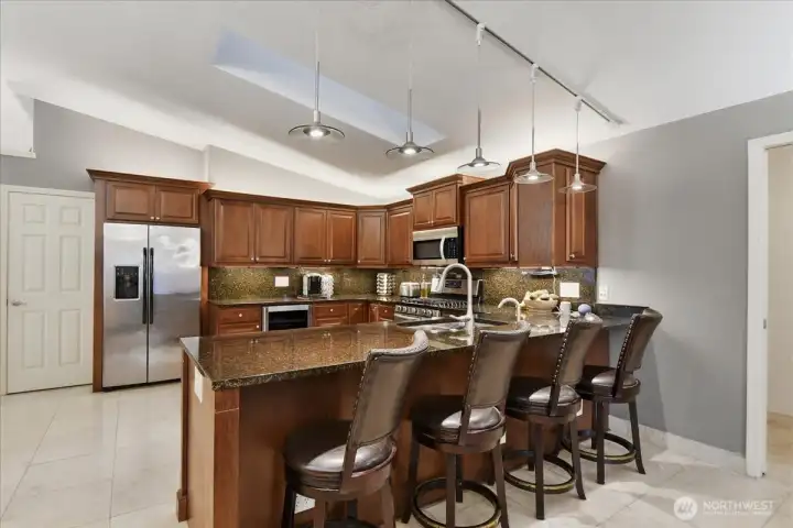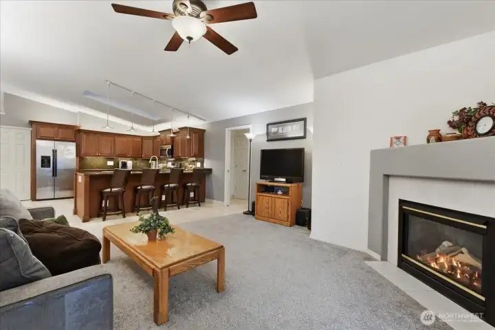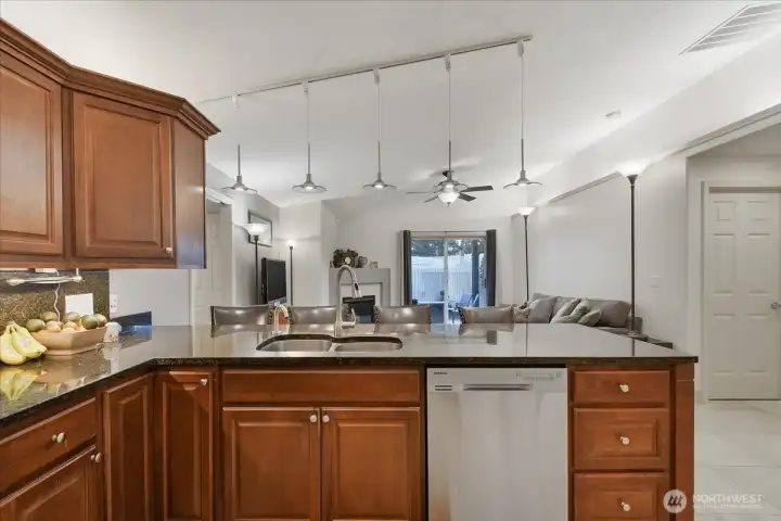 Tucked into a quiet street with no HOA, this home is main-level living at it's spacious best! A 1706sqft split-floorplan is made to feel even more generous with vaulted ceilings and a great room design. In the kitchen, bright tile floors and richly toned cabinets are accented by beautiful granite counters and matching backsplash. An eat bar at the kitchen counter lends versatility to the great room, and the kitchen opens to a view of both the gas fireplace and covered back patio. A south-facing skylight gracing the kitchen adds a dollop of sunshine exactly where you need it. The carpeted primary suite includes a walk-in closet and a gorgeously appointed ensuite bath that makes every day a spa day! Featuring a granite double vanity, a sunken jetted tub, and a tile walk-in shower complete with two showertower multi-showerheads, this primary bathroom provides nothing short of a resort-style experience. The dedicated laundry room includes a sink for full functionality, with garage access. The second bathroom features a granite vanity, a tub with a showertower, and is situated between the carpeted secondary bedrooms. Out back, you'll find a covered patio and a fully-fenced, low-maintenance space that is thoughtfully designed for entertaining and relaxing in the dappled shade of flowering & decorative trees. Inside & out, this 1-level ranch is full of details to ensure you'll feel luxuriously at home. Take a tour, fall in love, and make it yours!