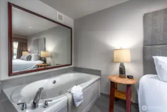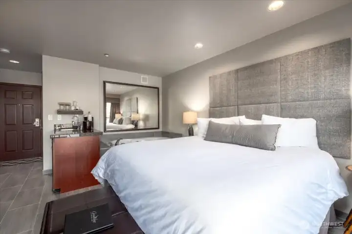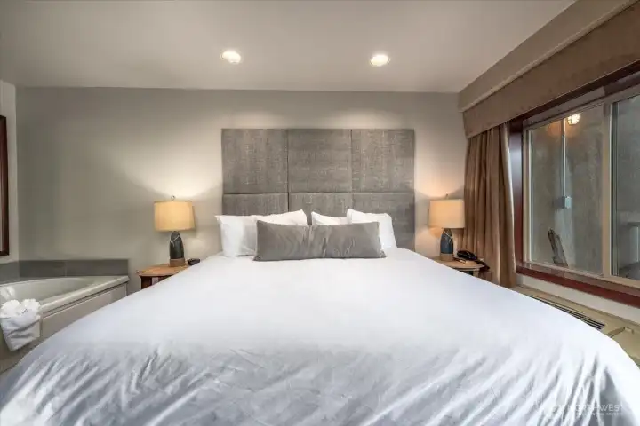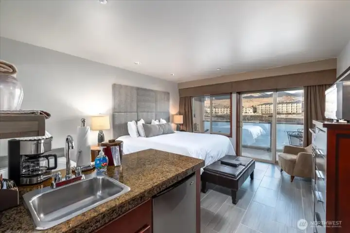 Lakefront affordability at its finest! Welcome to Unit 712 at Grandview on the Lake—where you truly can’t get any closer to the water. This KING Jacuzzi Suite offers a unique blend of condominium ownership with a resort-style, hotel atmosphere, making it a great SHORT TERM RENTAL investment or personal getaway. This cozy, ground-level studio is tucked away in the 700 building, offering added privacy while still providing direct access to the waterfront. Enjoy a plush king bed, a large Jacuzzi tub, 3/4 bath, and a convenient wet bar complete with sink, microwave, and mini fridge. A fireplace adds warmth and ambiance for relaxing off-season stays. Step outside to your private deck right on the water or take advantage of the expansive lawn area with nearby BBQs and easy lake access. The unit comes fully furnished and turnkey, with an onsite rental company for seamless management. Grandview on the Lake amenities include a stunning pool, hot tub, snack bar, and buoys for registered guests—all in a prime downtown Chelan location close to shops, dining, and entertainment. HOA dues cover nearly everything: water, sewer, garbage, power, internet, TV, exterior insurance, and common area maintenance. Whether you're looking for a competitive-priced short-term rental or your own lakeside retreat, this is an unbeatable opportunity on Lake Chelan!