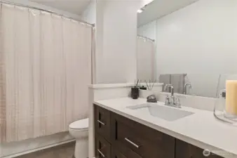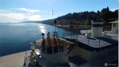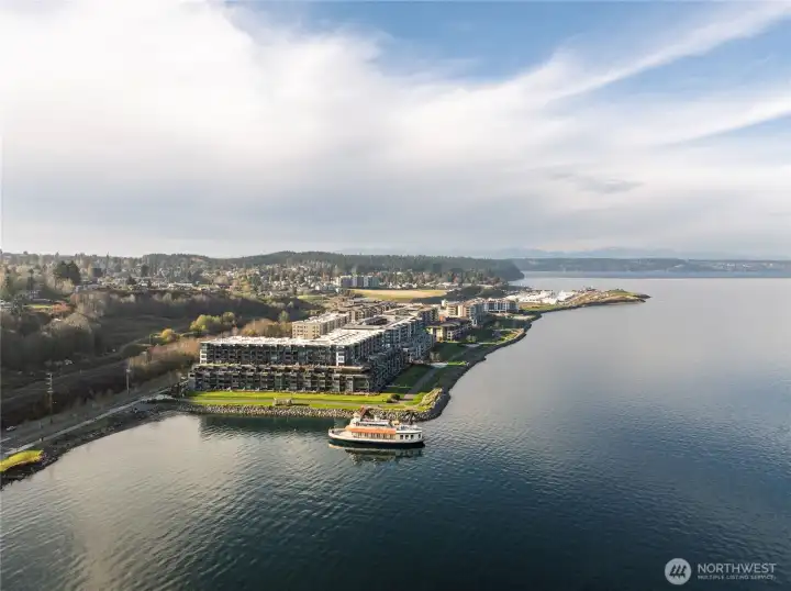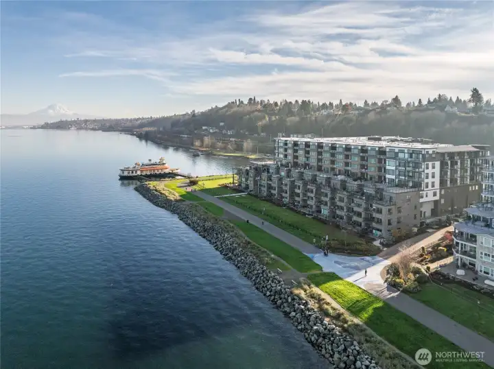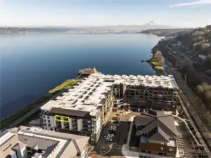 Water views, Vashon Island & the distant Cascades set the scene — waterfront living & Pt. Ruston's celebrated shops, dining & cinema steps from your door. One of only 5 units in the Pt. Ruston Rainier Building with this coveted layout — spacious, sophisticated, and designed to live large. Inside, refined elegance unfolds at every turn. The stunning great room features soaring tray ceilings, an electric fireplace & a covered balcony with captivating views. The chef's kitchen is a true showpiece — Bosch appliances, a striking quartz waterfall peninsula, rich custom cabinetry, pull-out storage & a generous walk-in pantry with wine bar. Retreat to the spa-like primary suite with a private view balcony, an expansive walk-in closet & a dedicated laundry room with pocket doors. A flexible den — easily a 3rd bedroom — stylish guest suite & luxurious 5-piece bath complete the thoughtful floorplan. The Rainier Building delivers resort-style living — secured entry via fob, key & mobile app, and 5th floor amenities including a club room, event & game lounge, movie night area & an outdoor patio with BBQ. Two dedicated garage parking spaces EV charging options available & a private storage room complete the package. Pet friendly. Ideal for the lock-and-leave lifestyle — sophisticated, secure & effortlessly luxurious. This is Pt. Ruston at its finest.
