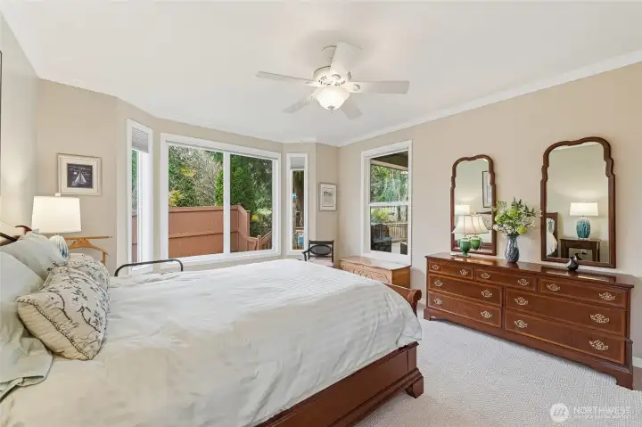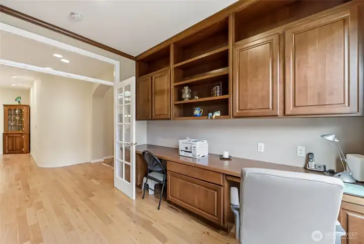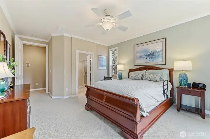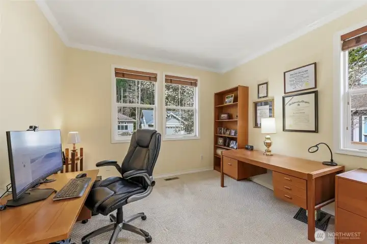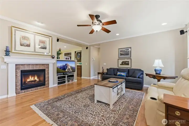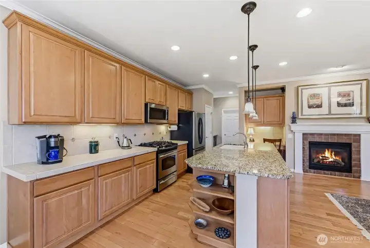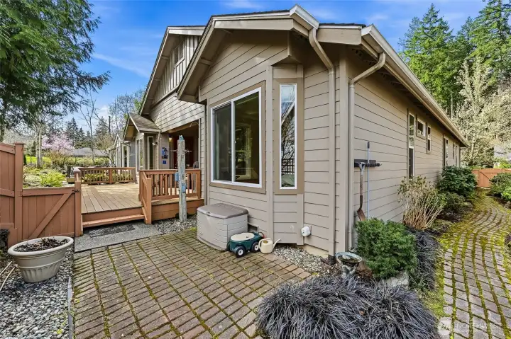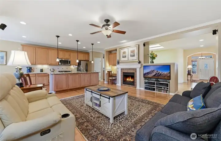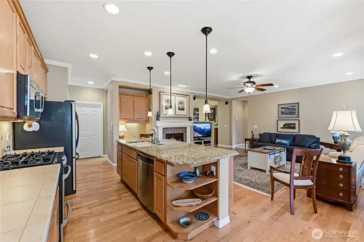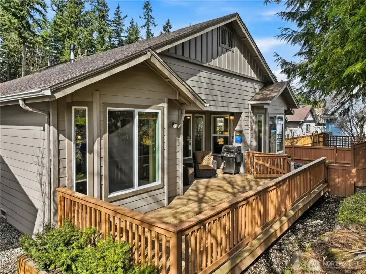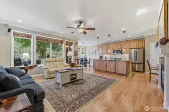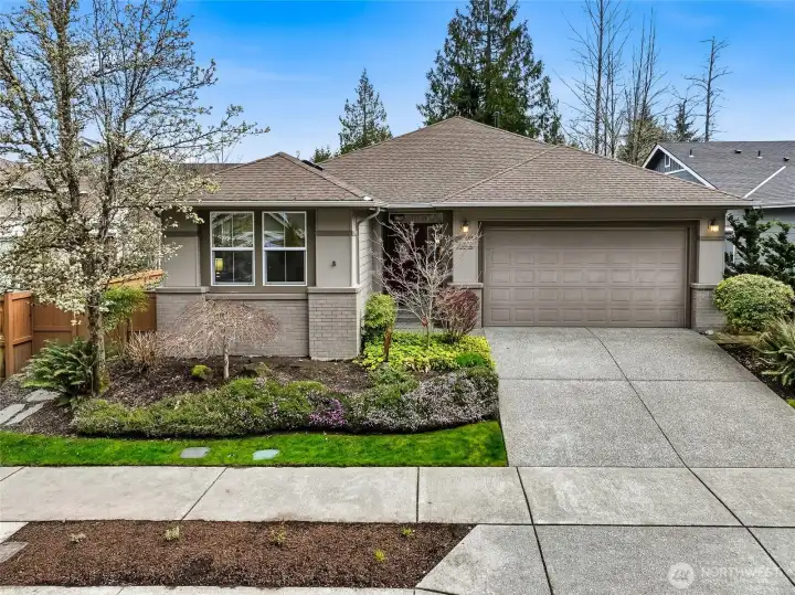 Captivating greenspace views that expand out to the golf course from this beautiful Bainbridge home. Enjoy easy living in this one level home with a peaceful & private setting just a couple of level blocks to the clubhouse. Warm hardwood floors run through the main living areas and there are distinctive architectural design elements such as crown molding, the curved wall and four panel skylight. The great room works perfectly for today’s lifestyles & has a surround sound system that includes a Denon amplifier and Sony speakers. The dining room seats 12 and is a wonderful space for holiday and special occasions dinners. Island kitchen with extra cabinets + pull-out shelves, wine fridge and a convenient day desk. Handsome office with gorgeous wood bookcases, cabinets, desk spaces and glass doors. Primary bedroom w/a ¾ bath, linen cabinet & walk-in closet w/organizers. Guest bedroom & full bath. Brand new W/D plus a utility sink in the laundry room. Generous garage w/work bench and shelving. Fully fenced backyard, nice deck and brick patio w/an included gas BBQ. New attic insulation, H20 tank & recirc hot water pump. Air con for hot summer days. A short jaunt to the clubhouse, the hub of Trilogy activities! Pre-inspected. Ages 55+